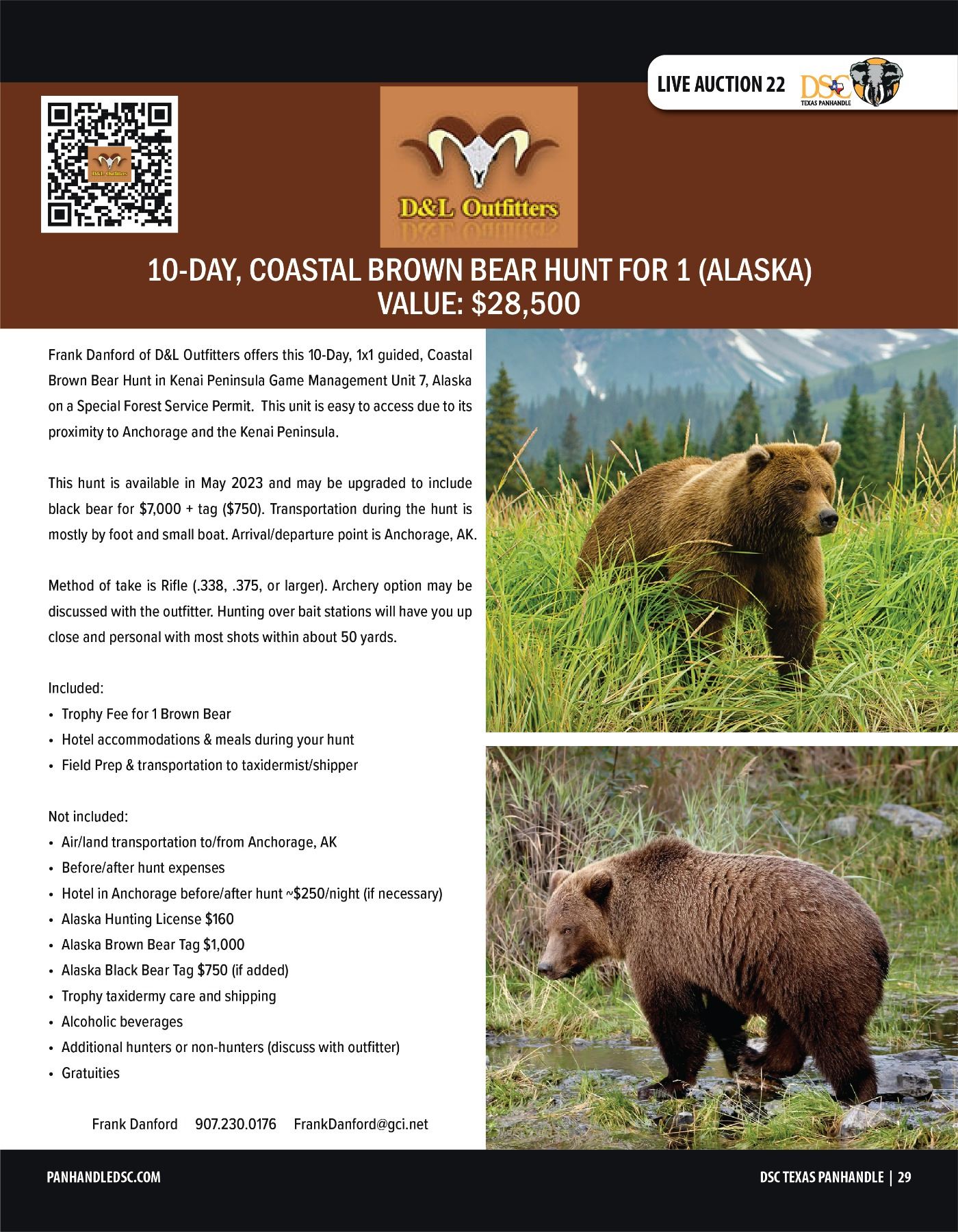 This hunt is available in May 2023 and may be upgraded to include black bear for $7,000 + tag ($750). Transportation during the hunt is mostly by foot and small boat. Arrival/departure point is Anchorage, AK.