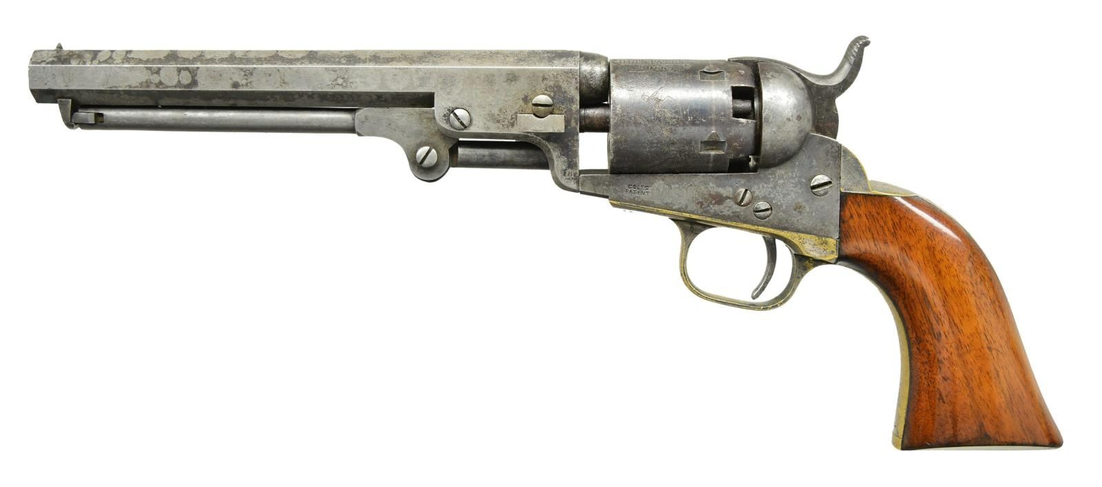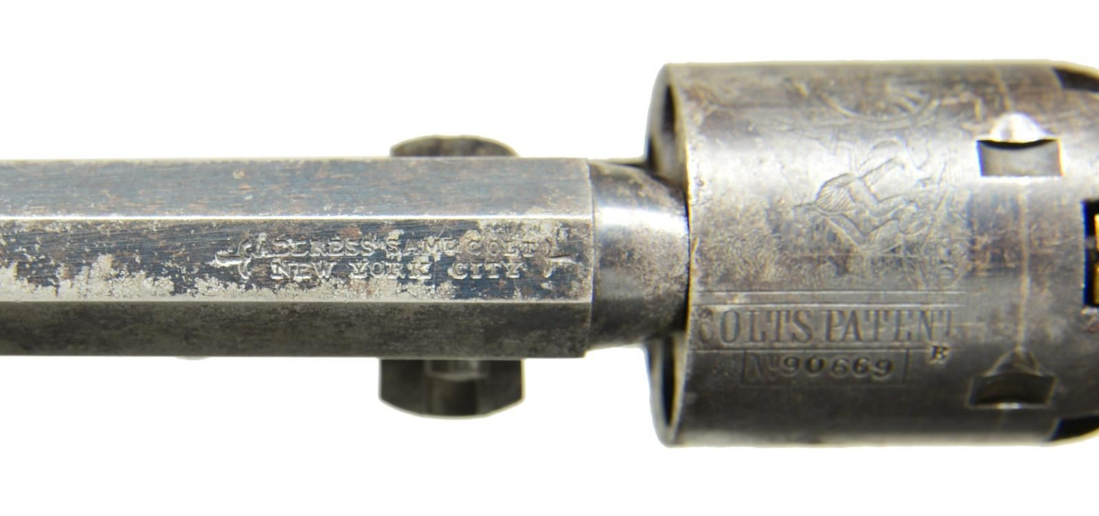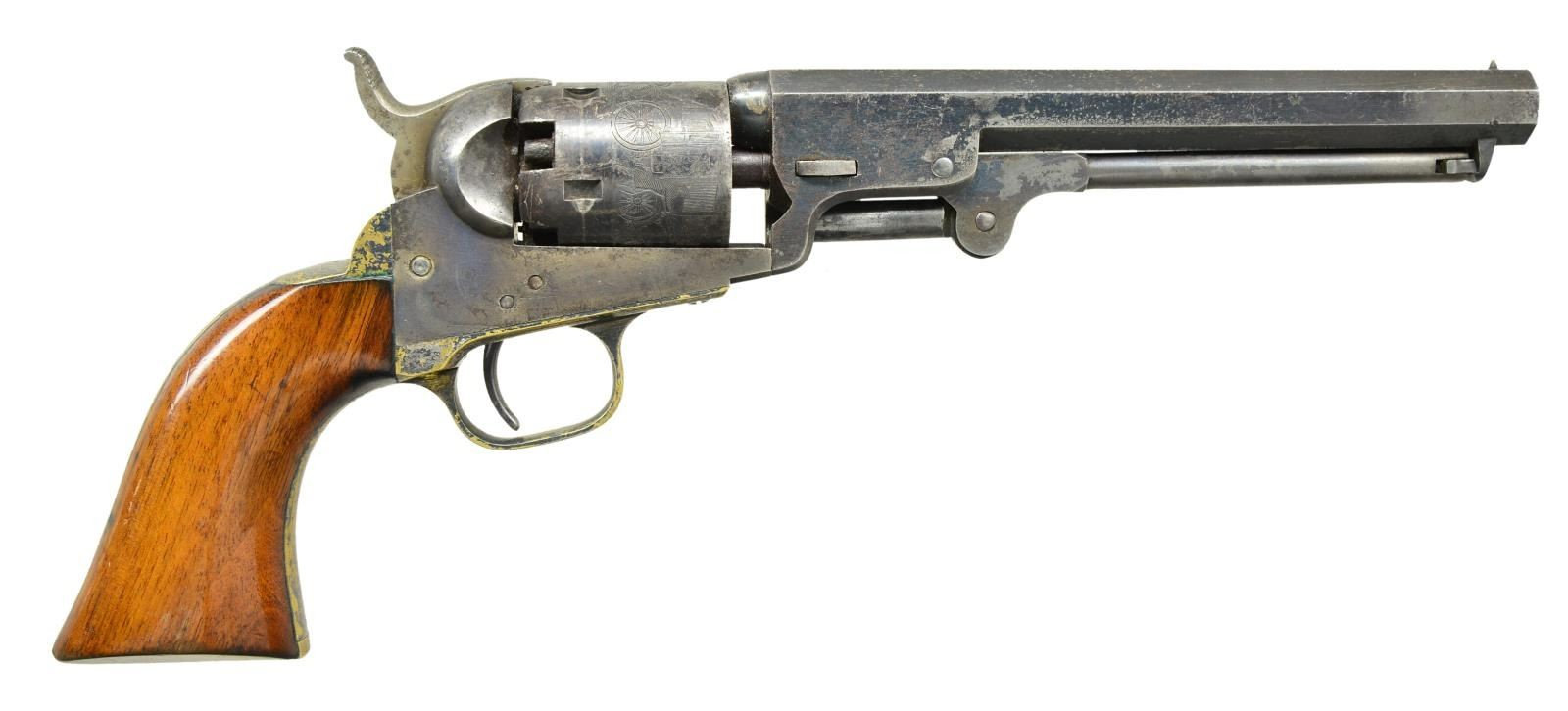 Cal. 31. S# 90669. Bbl. 6" octagon w/ New York address & cone type brass sight. Round five shot cyl. w/ stagecoach scene roll engraving. Blue & case colored finish w/ silver finished grip straps. 1 Piece walnut grip. Butt of gun has hand scratched initials “JWM”. Mfg. 1854. CONDITION: very good. Bbl. retains 40% dull blue on right side, left side is fading to gray. Cyl. retains 60% dull blue & retains very good scene. Frame shows over 30% case colors being stronger on the right side. Grip straps have over 60% silver acquiring a dark tarnish. Grip finish shows light wear & marks. Sound mechanics. Pitted bore retains largely intact rifling. (01-22902/DS). ANTIQUE. $1,000-1,500.