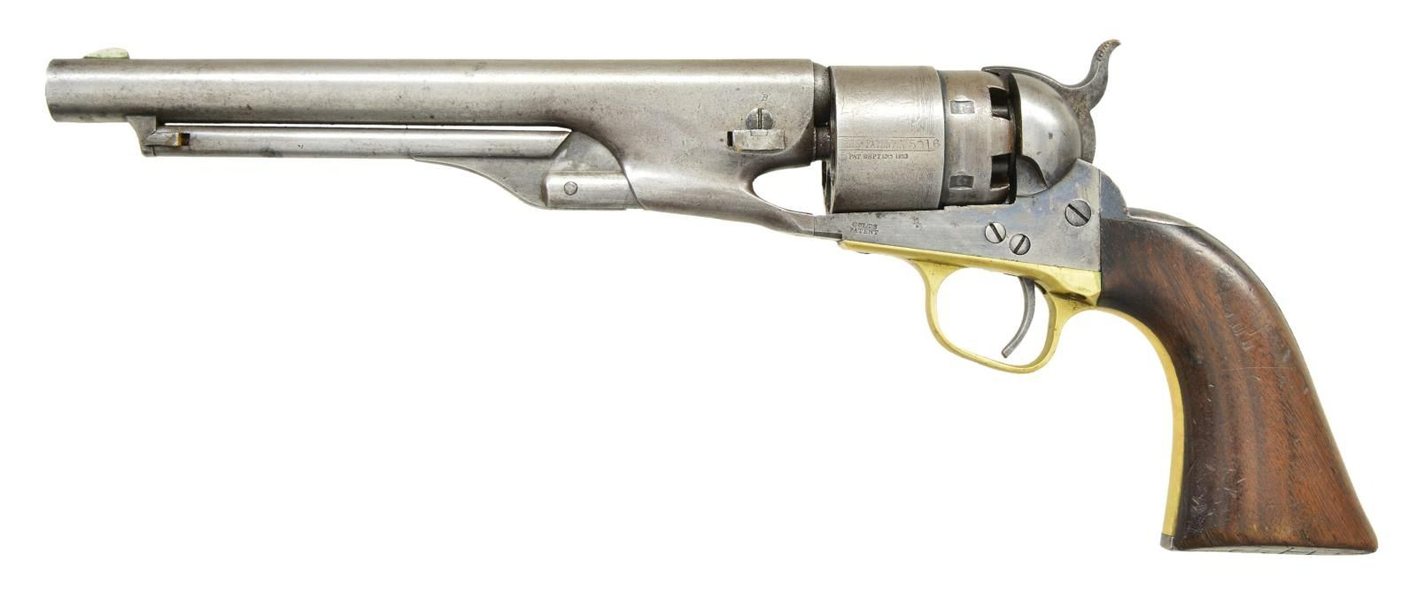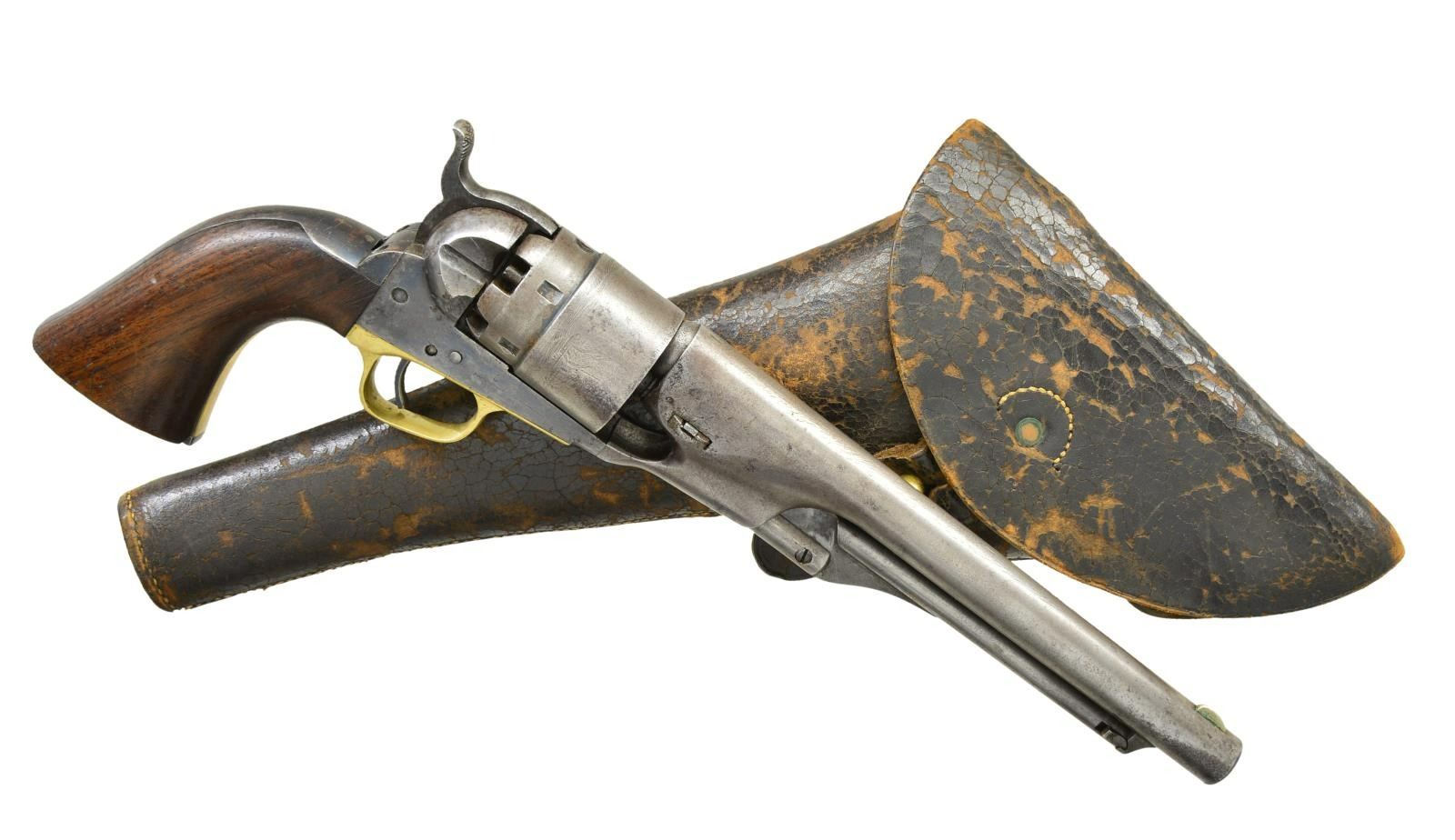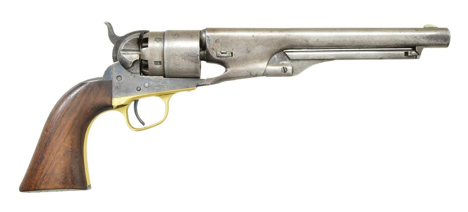 Cal. 44. S# 55016. Bbl. 8" round w/ German silver blade front sight. Markings on top flat of bbl. are partially obscured by intentionally added coarse file marks intended to reduce glare. Round rebated six shot cyl. w/ naval engagement scene roll engraving. Blue & case colored finish w/ silver finished brass trigger guard. Action has provisions for shoulder stock attachement. 1 Piece walnut grip. Butt of right panel has initials “CGEK”. Left panel has initials “J.H.”. Inspection mark “B” is found on left side of bbl. w/ “H” on front grip strap & “C” on back grip strap behind hammer. Bbl., frame, grip straps, cyl. & wedge have matching numbers. S# on trigger guard is partially obscured by intentional filing. Mfg. 1862 during the American Civil War. UNATTACHED ACCESSORIES: leather flap holster in fair condition. Leather has cracking & peeling finish. CONDITION: very good. Bbl., cyl. & loading lever have faded to gray showing handling marks & small spots of pitting. Right side of bbl. shows series of small dents in wedge area. Cyl. retains 75% scene. Frame has nicely visible colors on its sides. Trigger guard has cleaned appearance w/ no remaining silver. Cyl. does not rotate when action is cycled. Lightly pitted bore retains strong rifling. (01-22888/DS). ANTIQUE. $1,000-1,500.