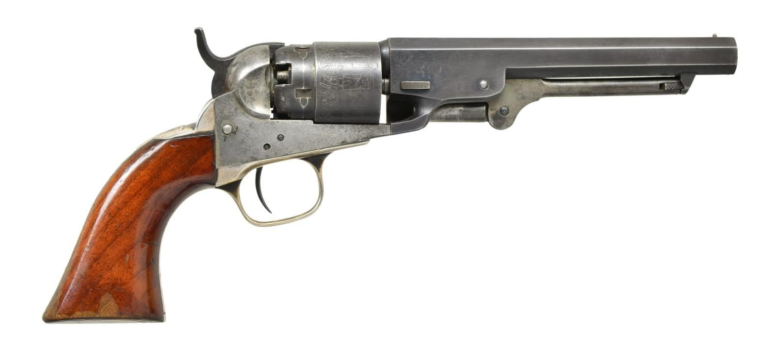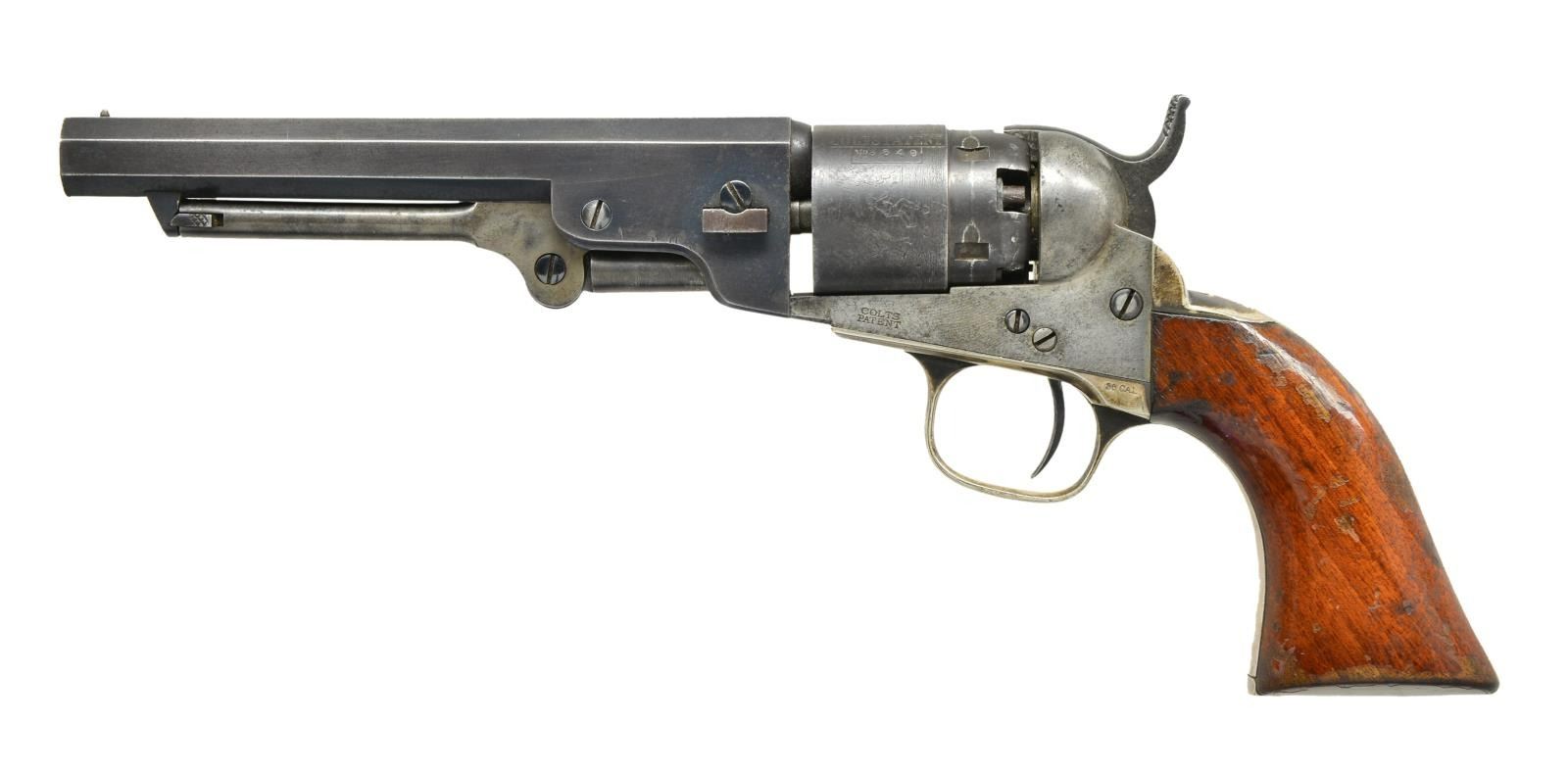 Cal. 36. S# 48649. Bbl. 5 1/2" octagon w/ New York address & brass cone sight. Round rebated five shot cyl. w/ stagecoach scene roll engraving. Blue & case colored finish w/ silver finished brass grip straps. 1 Piece walnut grip. CONDITION: very good. Bbl. retains 70% dull fading blue showing carry wear. Cyl. has fading finish & retains very good scene. Frame has faded gray appearance. Loading lever shows a small amount of fading case colors. Grip straps have over 90% silver finish showing a spotted dark tarnish in protected areas. Action is worn, cyl. exhibits some side play. Lightly pitted bore retains strong rifling. (01-22901/DS). ANTIQUE. $1,000-1,500.
