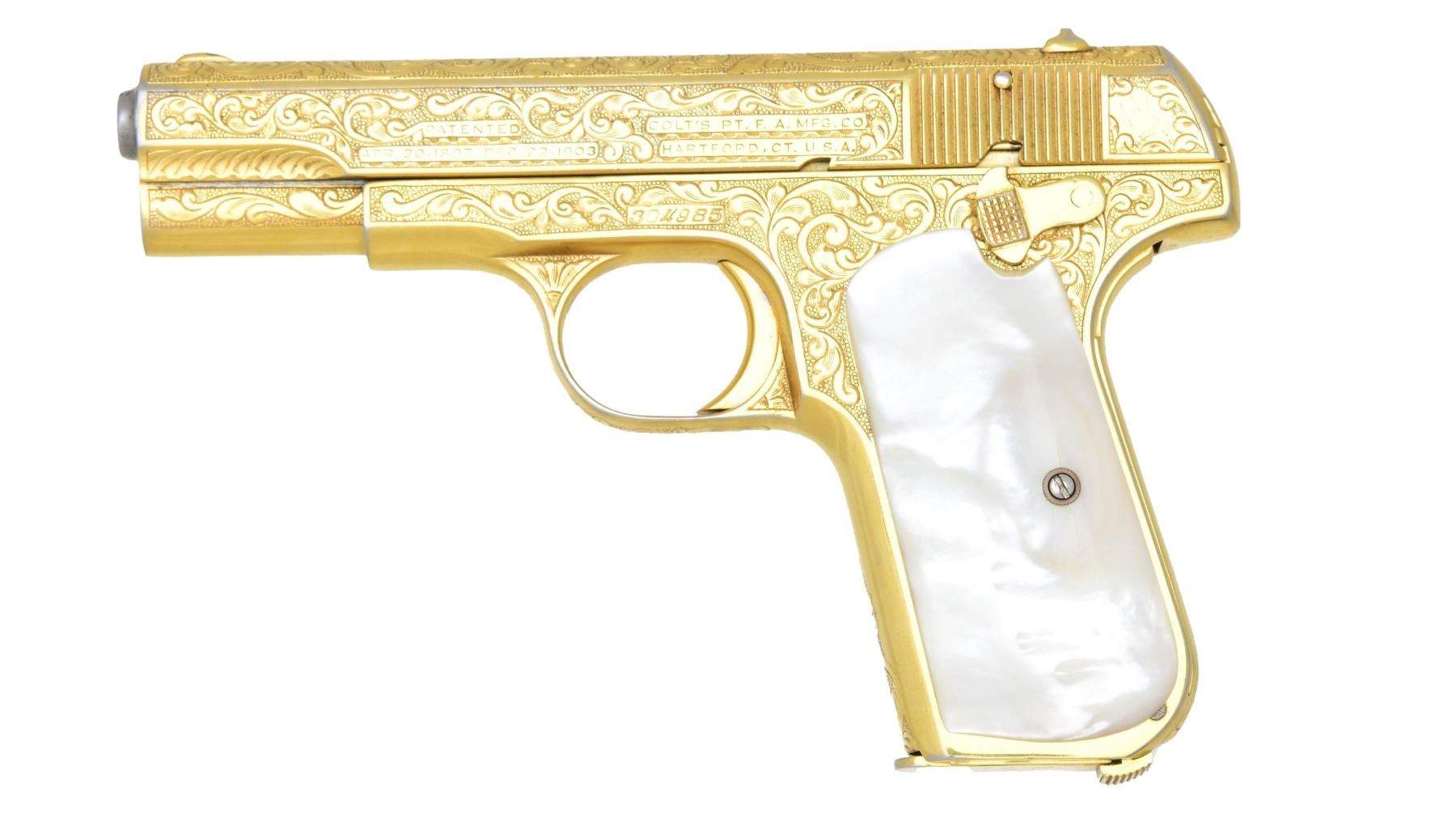 Cal. 32 ACP. S# 304985. Bbl. 3 3/4". Attractive full coverage vine type foliate scroll w/ punch dot backgrounds & gold finish. Blade front sight w/ U notch rear sight. 2 piece pearl grips. Mfg. 1919. MAGS: 1 detachable 8 rd. UNATTACHED ACCESSORIES: Serial Number: 304985 / Caliber: .32/c / Barrel Length: 3 3/4" / Finish: Blue / Type of Stocks: Not Listed / Shipped To: T. B. Davis Arms Company / Address: Portland, Maine / Date of Shipment: August 26, 1919 / Number of Same Type Guns in Shipment: 20". CONDITION: over 90% gold finish showing carry wear. Very good grips. Lightly pitted bore. PROVENANCE: From the Collection of a Tennessee Gentleman. (24-4529/DS). CURIO. $1,000-1,500.
