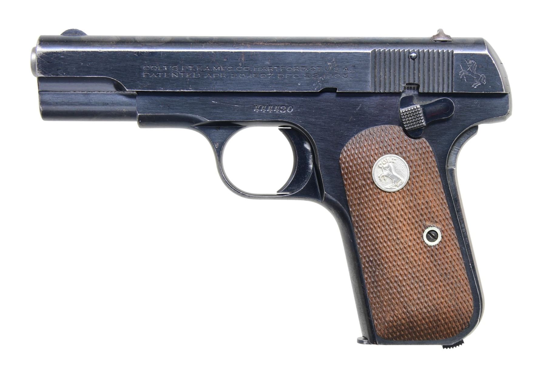 Cal. 32 ACP. S# 444430. Bbl. 3 3/4". Semi-circular front sight w/ U notch rear sight. Blue finish. 2 piece checkered walnut grips w/ silver rampant colt medallions. MAGS: 1 detachable 8 rd. UNATTACHED ACCESSORIES: unmarked 1 piece box. CONDITION: 80% lightly worn blue showing edge & carry wear w/ scratches & spots of light pitting. Grips show light wear. Good bore. PROVENANCE: From the Collection of a Tennessee Gentleman. (24-4531/DS). CURIO. $700-1,100.