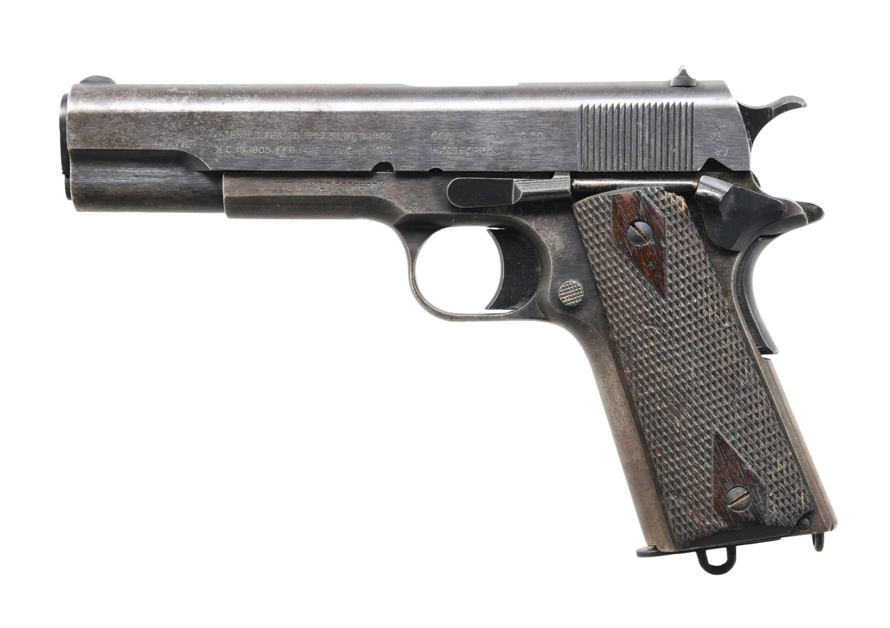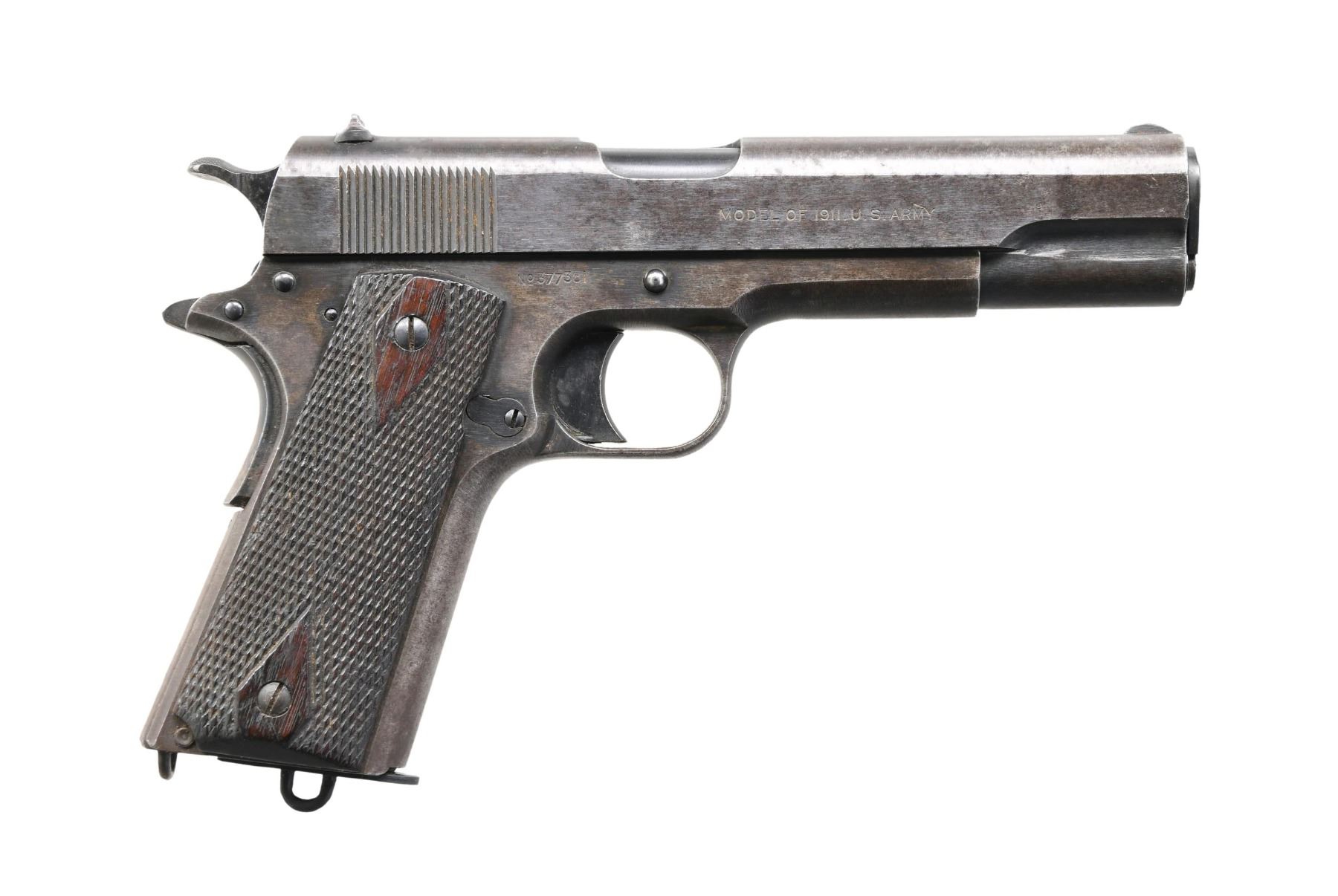 Cal. 45 ACP. S# 377381. Mfg. 1918 with brushed blue "Black Army" finish. Replacement parts includes Springfield 5" barrel similar to type 12, Type C safety lock tab, & Type B slide lock. Other parts are correct including double diamond checkered walnut grips; frame has eagle S12 proof. MAGS: 1 reblued WWI 7 rd. mag. CONDITION: this pistol has fair original finish with large areas of patina & worn finish. Metal shows handling marks, scratches & peppery oxidation; old cleaning on bottom of frame has partially worn US Property marking. Good grips with wear & areas of flattened diamonds. Barrel has very good bluing & good bore. (24-4938/MD). CURIO. $1,200-1,800.