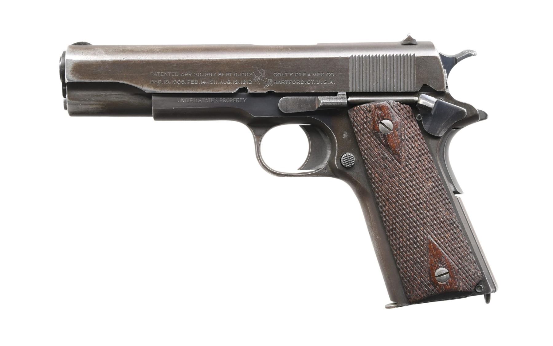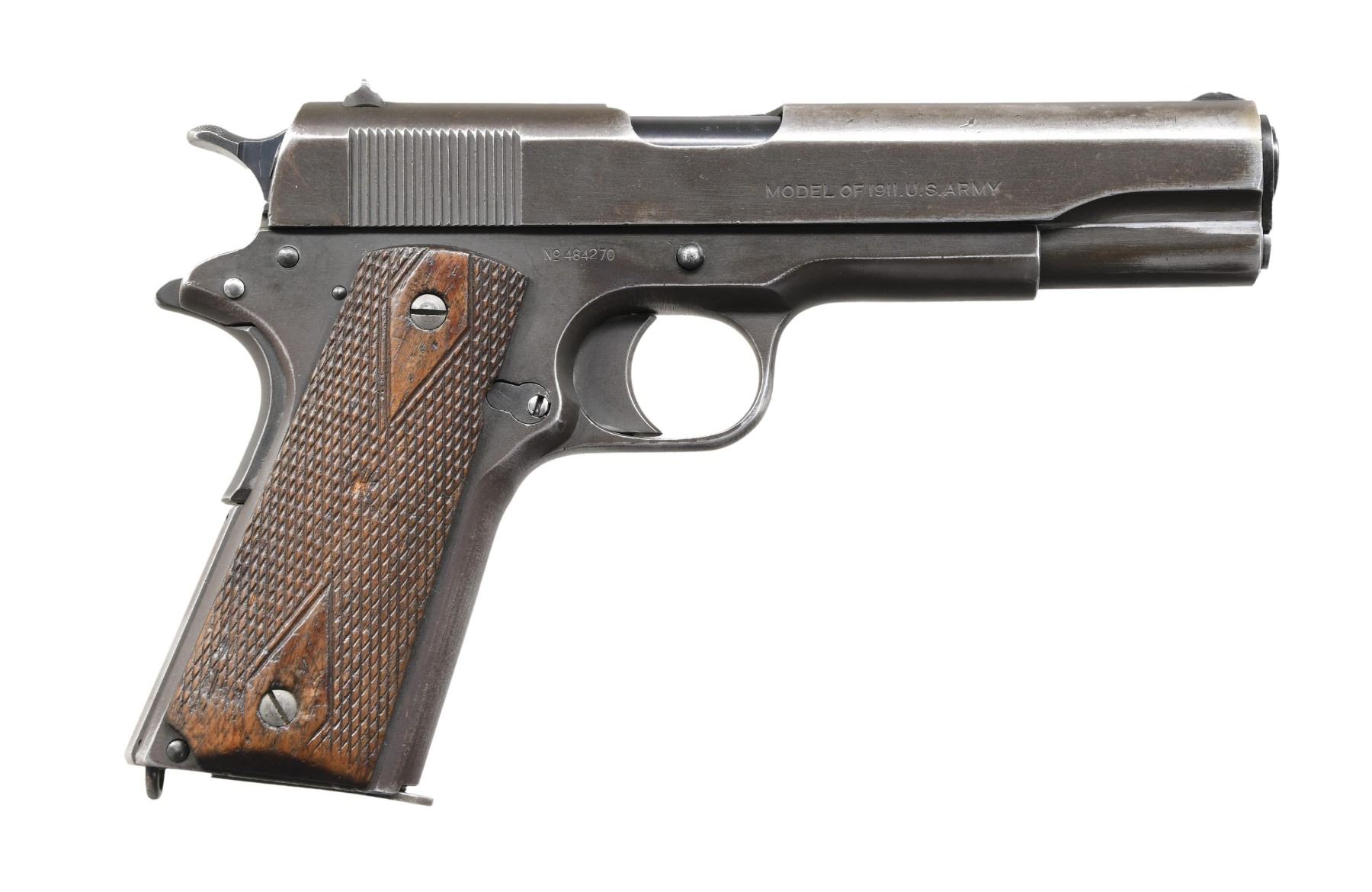 Cal. 45 ACP. S# 484270. Originally mfg. late 1918 with "Black Army" finish before the Armistice of 1918. This pistol appears to have all correct parts included; replacement 5" barrel installed. Frame has Eagle "17" proof & Type 1 checkered walnut double diamond grips. MAGS: 1 parkerized 7 rd. & 1 Colt commercial 7 rd. UNATTACHED ACCESSORIES: box containing correct Type 5 barrel having fair finish & worn bore; barrel link & pin on installed barrel. CONDITION: pistol has well faded & worn finish having a patina & parkerized appearance. Fair grips with numerous marks. Very good bore. (24-5294/MD). CURIO. $1,500-2,500.