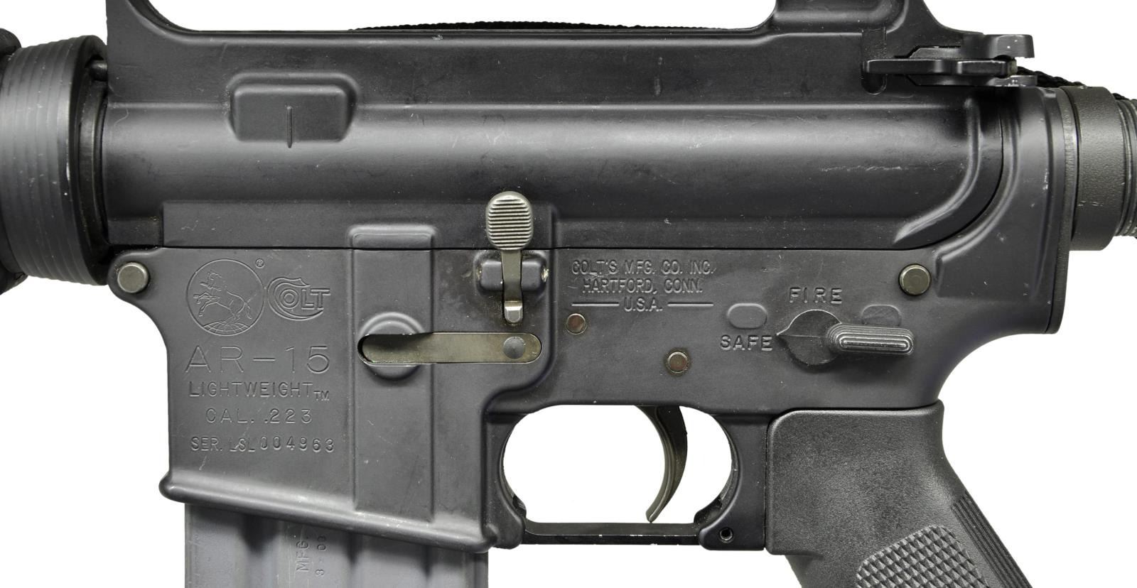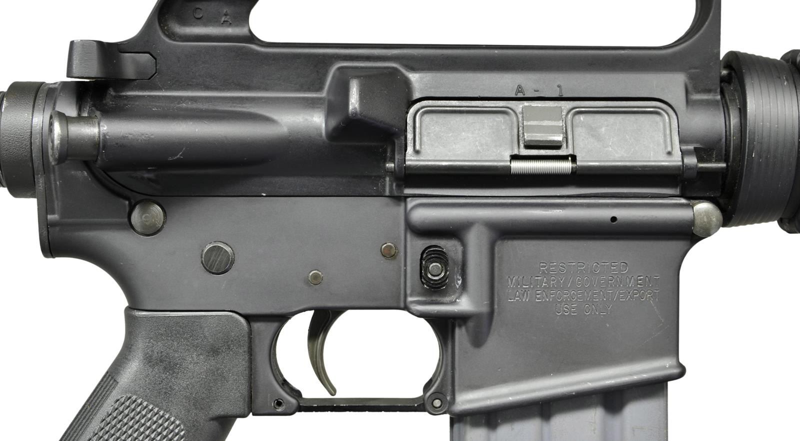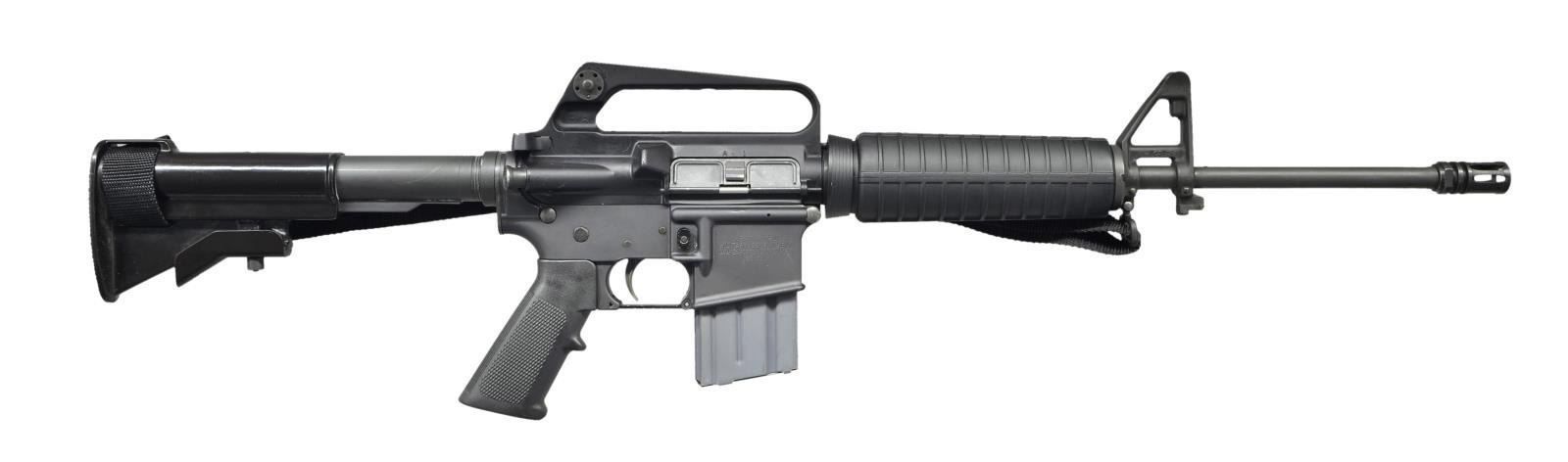 Cal. 223. S# LSL004963. Bbl. 16". Matte black finish. Barrel marked; "CMP 5/56 NATO 1/9", w/ threaded muzzle currently sporting an A2 flash hider. Protected post front sight / gas block / bayonet lug / sling swivel. 6.5" round, A2 handguards secured w/ tapered delta ring. Carry handle upper receiver w/ round forward assist, brass deflector & E1 dual aperture peep sight. Upper marked "C A" below rear sight & "A-1" above dust cover. Lower receiver marked on left side, mag well; "COLT / AR-15 / LIGHTWEIGHT / CAL .223" above serial number & below Colt logo. Marked above trigger; "COLT'S MFG. CO. INC. / HARTFORD, CONN. / USA". Right side of receiver marked on mag well; "RESTRICTED / MILITARY / GOVERNMENT / LAW ENFORCEMENT / EXPORT / USE ONLY". No pinned block in lower receiver. Slotted bolt carrier. Front & rear push pins for takedown. 2 position collapsible aluminum shoulder stock. Currently sporting black nylon sling. MAGS: 1 aluminum Factory mag, dated Mar, 2000. CONDITION: Traditional dark gray finish on lower receiver w/ darker shade on upper receiver. Coverage remains complete & consistent w/ gentle thinning in areas of mechanaical intervention & a few high spots to indicate use. Bright bore w/ strong rifling. Fire control mechanism appears to function correctly when cycled by hand. (23-1112/JZ). MODERN. $500-900.