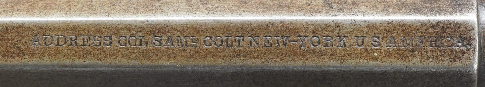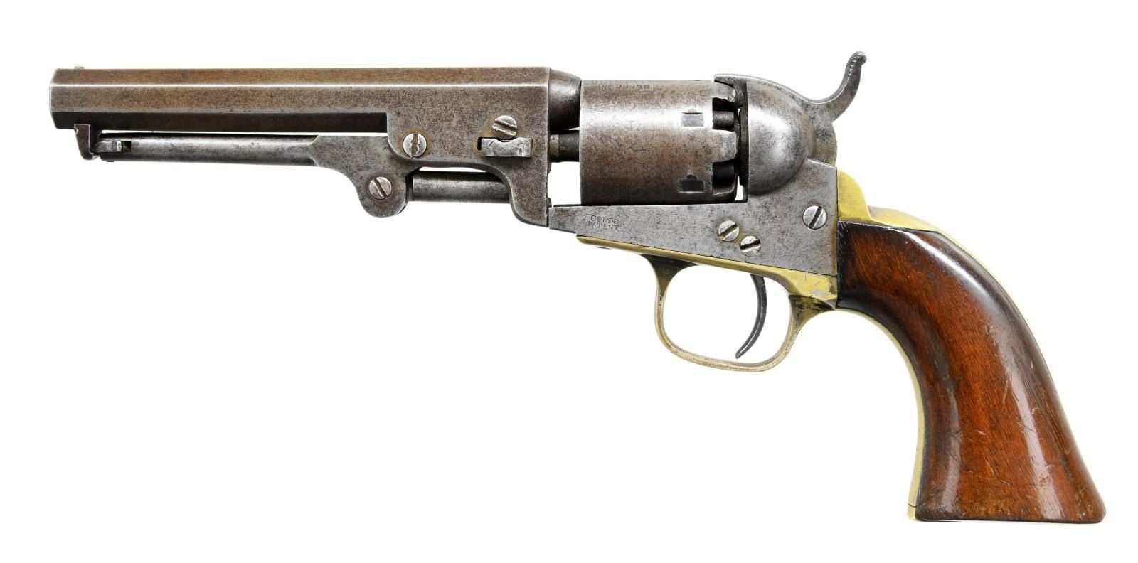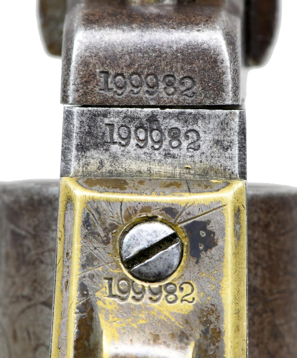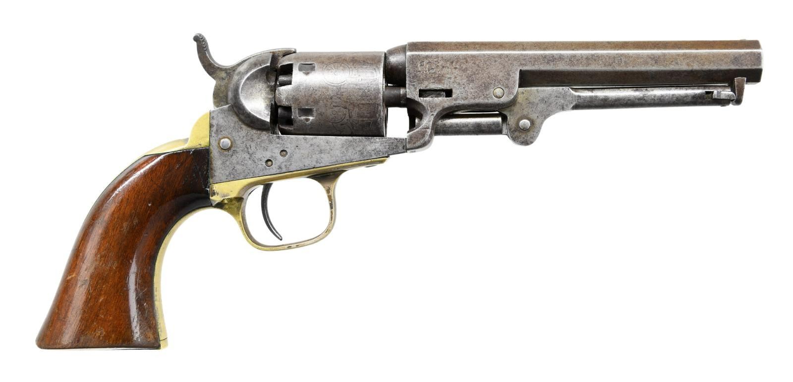 Cal. 31. S# 199982. Bbl. 5". 6 Shot variation Mfg. 1862 w/ matching numbers; including the wedge. Cylinder retains solid stagecoach scene. Front sight is worn nearly flat. One piece wooden grips. CONDITION: Frame pins have snapped off but remain in the Bbl. holes which makes Bbl. to frame fit quite loose. Metal is a brown/gray patina w/ tarnished brass. Grips have an added coat of varnish over dings & dents. Bore is fair & dark w/ strong rifling but moderate pitting throughout. (01-22712/CW). ANTIQUE. $500-700.