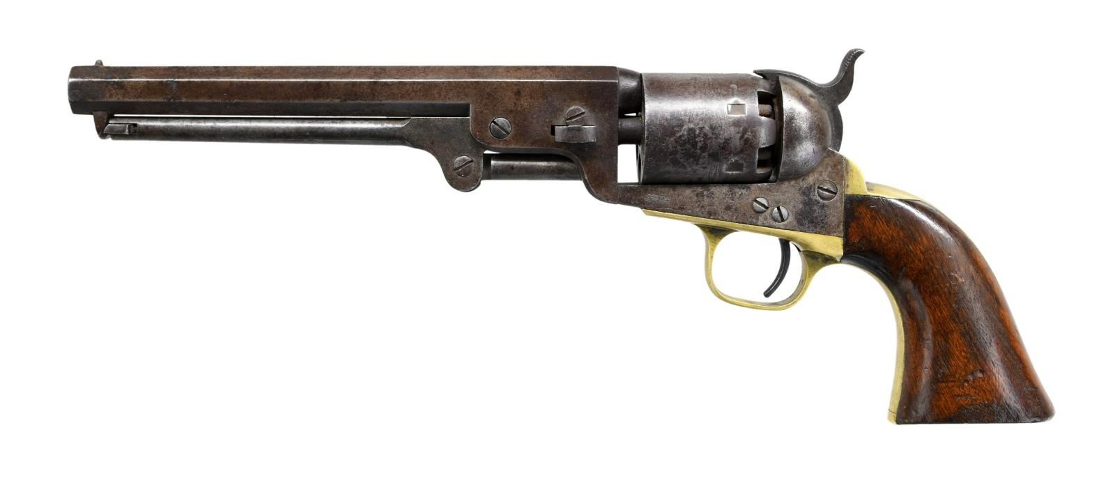 Cal. 36. S# 136661. Bbl. 7 1/2". 4th Model Mfg. 1863 w/ matching numbers; including the wedge. Cylinder has no visible number & the battle scene is now a whisper w/ only a faint outline visible. One piece wooden grips. CONDITION: Action works properly. Metal is a fading blue/gray patina w/ some pinpricks & corrosion. Brass is tarnished. Grips have an added coat of varnish over dings, dents & chipping. Fair bore w/ fairly solid & defined rifling w/ light pitting & 2 larger heavy & deep pits about mid bore. (01-22713/CW). ANTIQUE. $700-900.