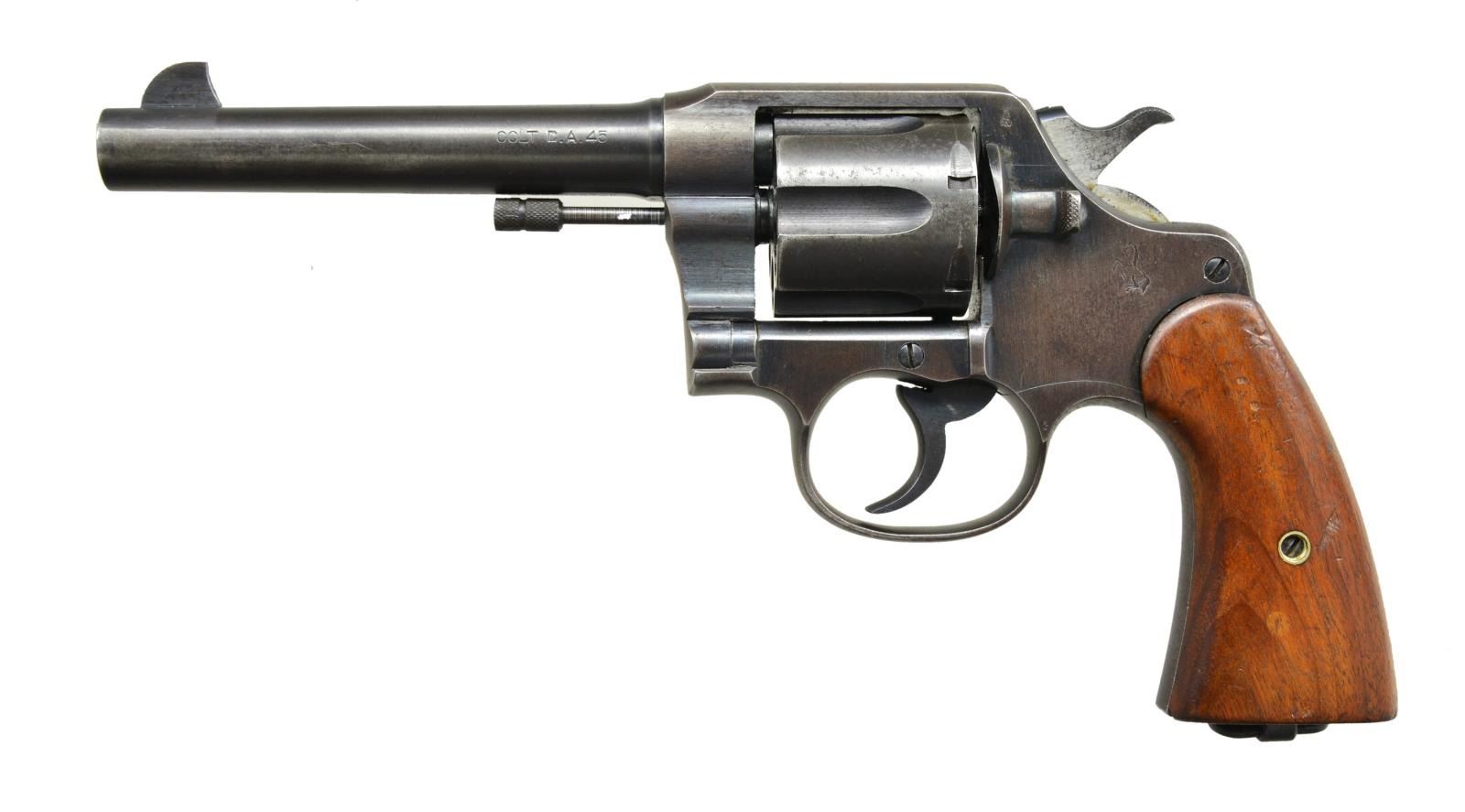 Cal. 45 ACP. S# 223706. Bbl. 5 1/2" with fin shaped blade sight; 1905 last barrel patent date and " "UNITED STATES PROPERTY" " on bottom. Mfg. 1919 with smooth oiled walnut grips pencil numbered 218722 on left and 223800 on right. Springfield Eagle S20 proof on left side near hammer. Rampant Colt on sideplate. Lanyard swivel at butt; U.S. Army marking and number removed leaving grips lightly proud. CONDITION: good to very good general appearance with mottled tone to cleaned light oxidation mostly on right side of frame. Light high point wear and beginning patina tone. Very good grips with light marks. Good bright bore with light occasional pitting and wear. (22-6361/NW). CURIO. $400-800.