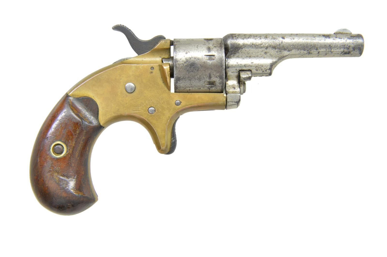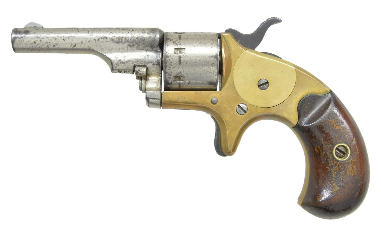 Cal. 22 RF. S# 76425. Bbl. 2 3/8". Bbl. has Hartford address. Matching numbers on bbl., grip panels & frame. Fixed rear sight & semi circular silver front sight. Standard production model. High spur hammer. Seven shot cyl. Brass frame w/ checkered spur trigger. Two piece walnut bird's head grips. Hammer will not hold at full cock. CONDITION: grips show scattered flaking & handling wear. Bbl. & cyl. are a silver pewter w/ a long deep scratch on bbl. from muzzle to Colt address, scattered dings, light pitting & oxidation. Frame is a pleasing mustard patina w/ some dings, light scratches & oxidation. Worn pitted bore. (01-22631/MJC). ANTIQUE. $200-400.