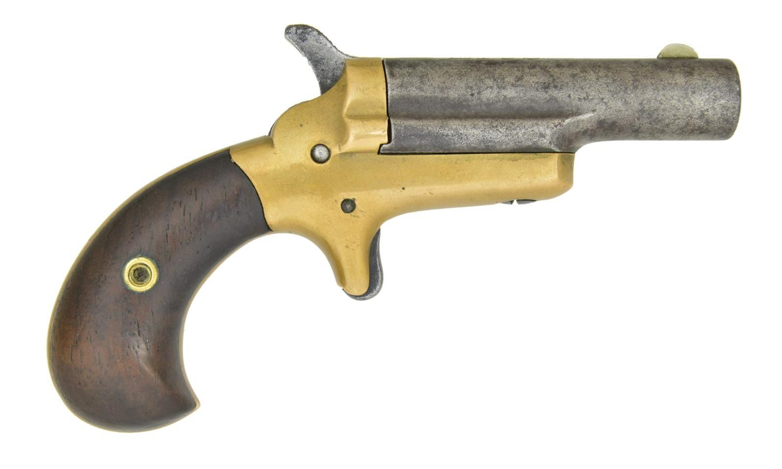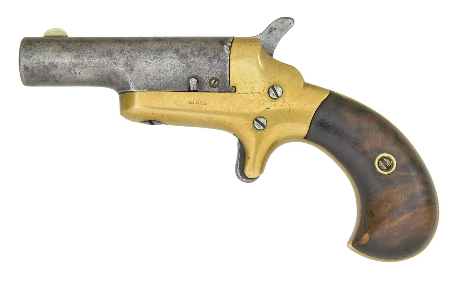 Cal. 41 RF. S# 29944 (Mfg. between 1875-1912). Bbl. 2 1/2" w/ German silver blade front sight. Brass frame. Matching numbered 2 piece bird's head walnut grips. CONDITION: bbl. has gray patina appearance w/ little blue remaining, pitting & marks. Brass has pleasing mustard patina finish w/ light marks & verdigris. Good wood finish w/ marks. Fair pitted bore. (23-1439). CURIO. $300-400.
