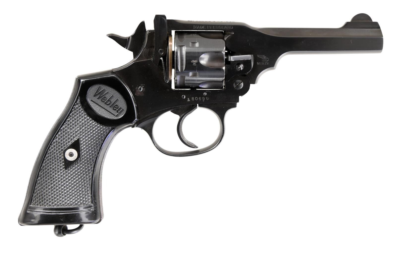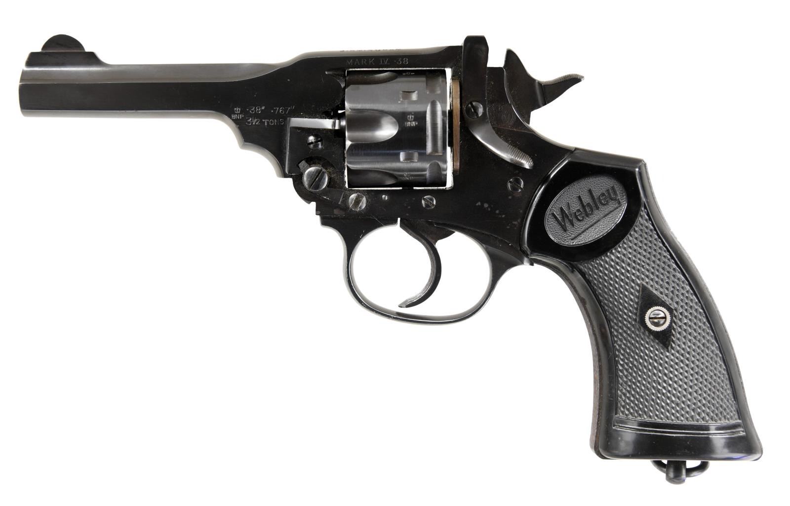 Cal. 38/200. S# A80695. Bbl. 4" w/ fixed notch rear sight & blade front sight. All matching numbers. 1950's production Webley MKIV revolver w/ British sale proofs on left side of bbl. Right side of bbl. has Webley bullet logo. Various parts have British proofs. Checkered grips w/ Webley logo. CONDITION: left grip panel has a small chip at front, grips otherwise show light handling wear. Metal retains 93% original blue w/ a few spots of light oxidation. Very good bright bore. (23-1051/MJC). CURIO. $300-500.