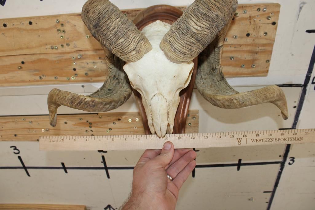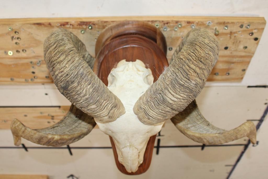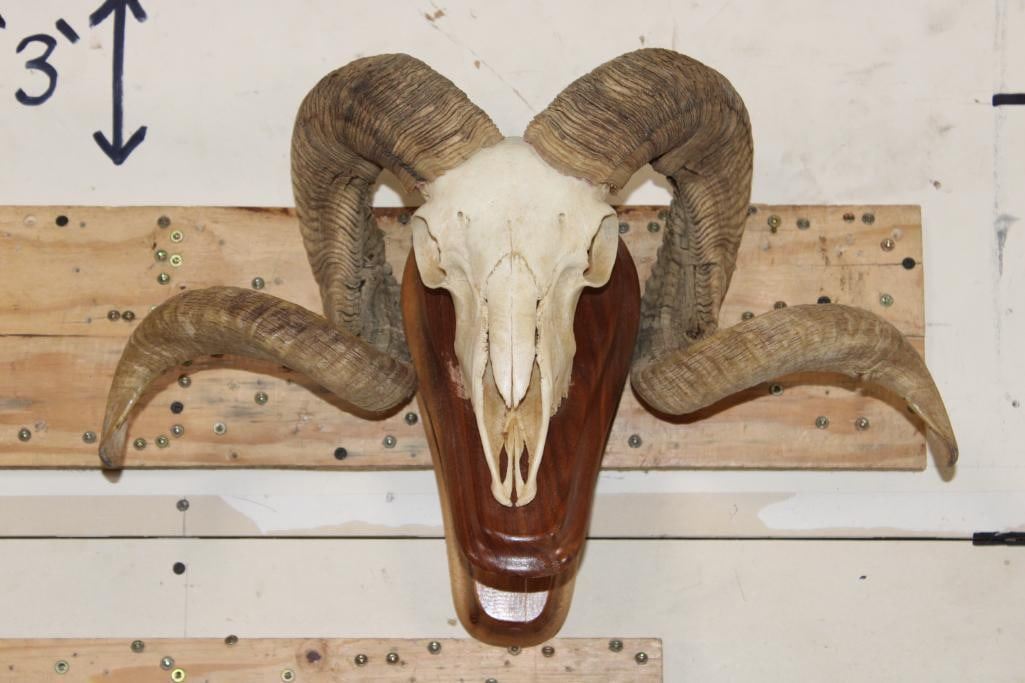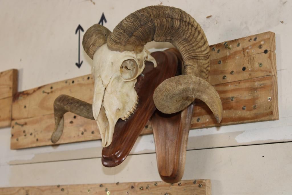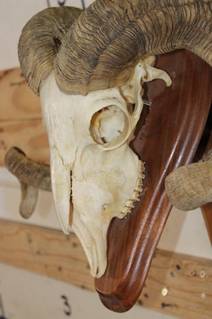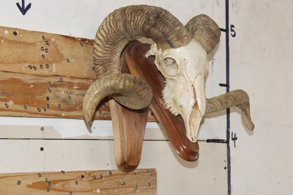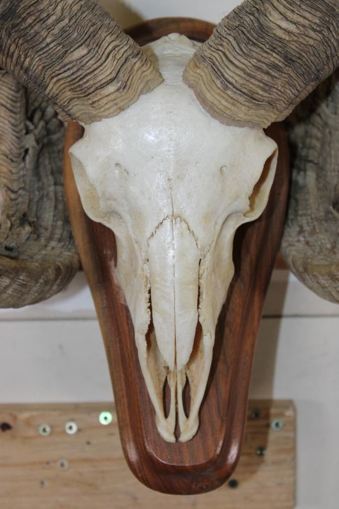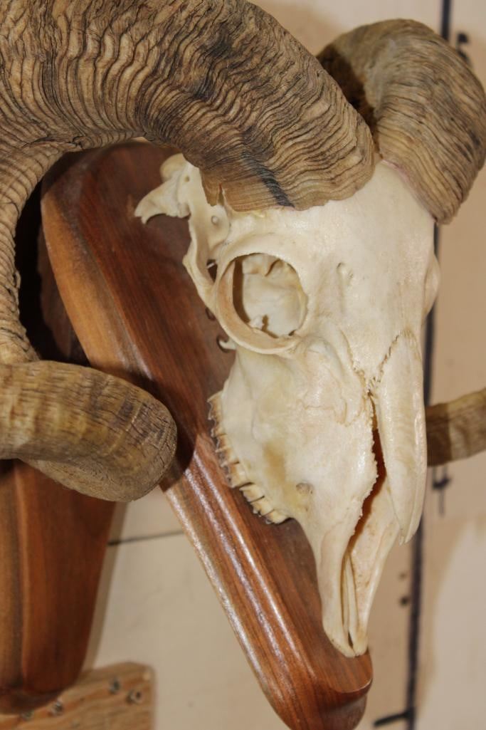 Nice CORSICAN RAM Skull on a Wooden Wall Pedestal. It has All its Teeth. TAXIDERMY