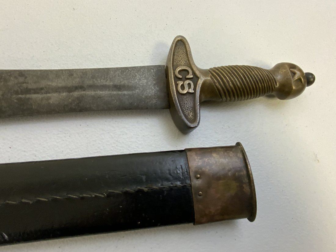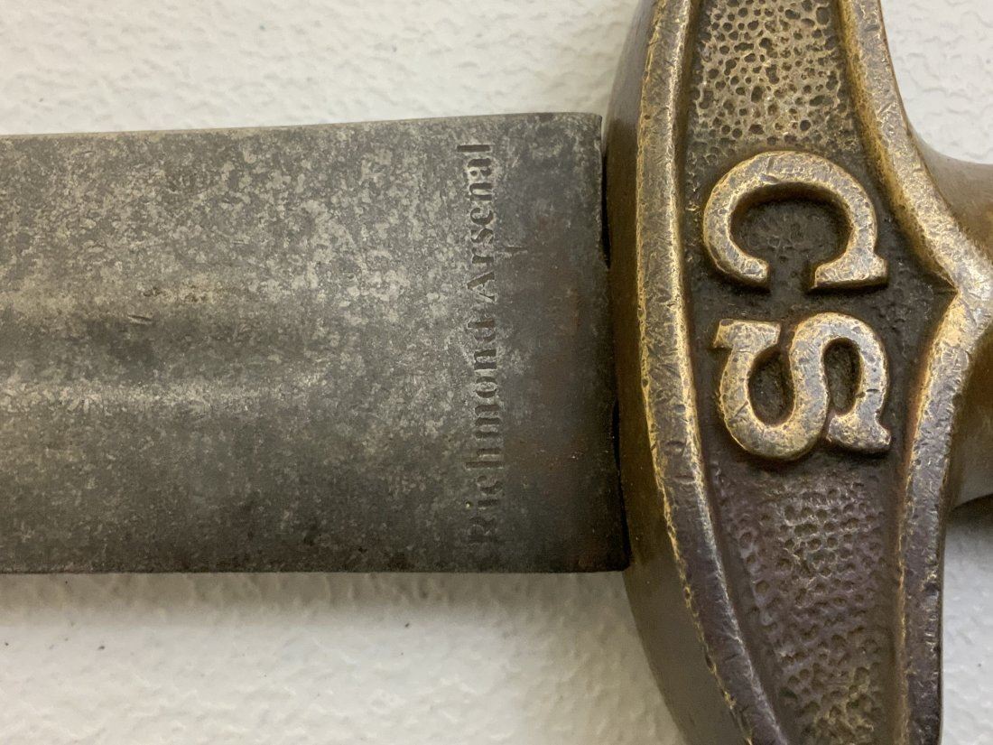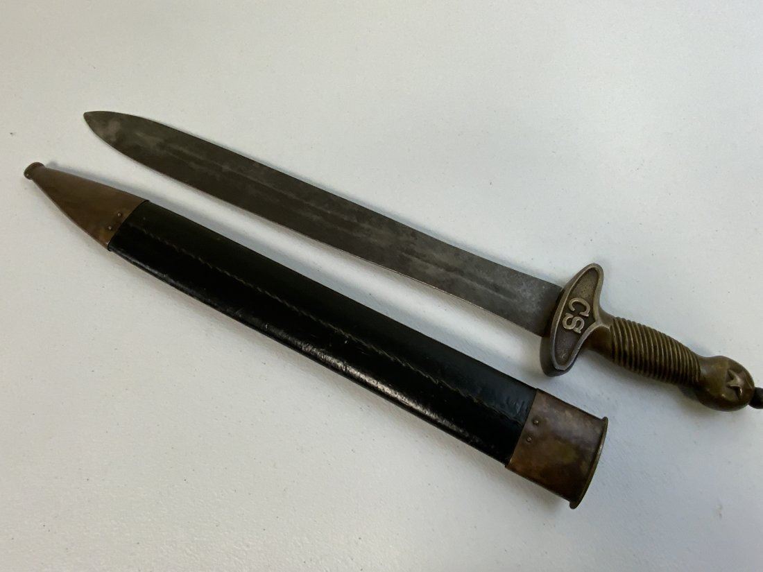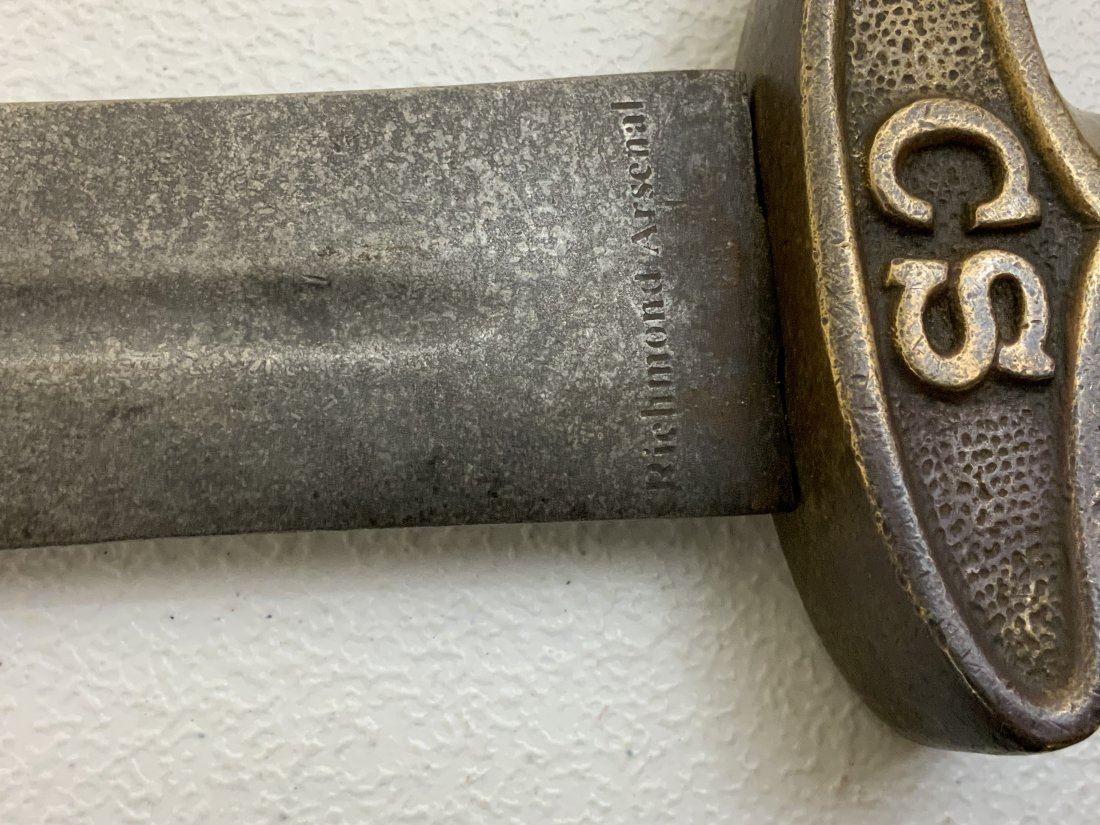CS TEXAS STAR RICHMOND ARSENAL CONFEDERATE SHORT SWORD. DISPLAYS GREAT AGE AND PATINA . LEATHER SHEET WITH BRASS FITTINGS. NICE WIDE BLADE WITH RICHMOND ARSENAL MARK. BELIEVED TO BE A POST WAR PRODUCTION SWORD . GREAT FOR DISPLAY OR REENACTMENT. 28" LONG WITH 19.5" LONG BLADE .