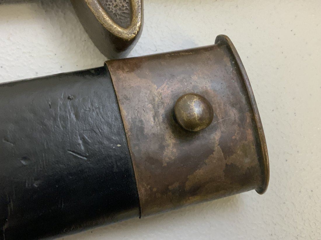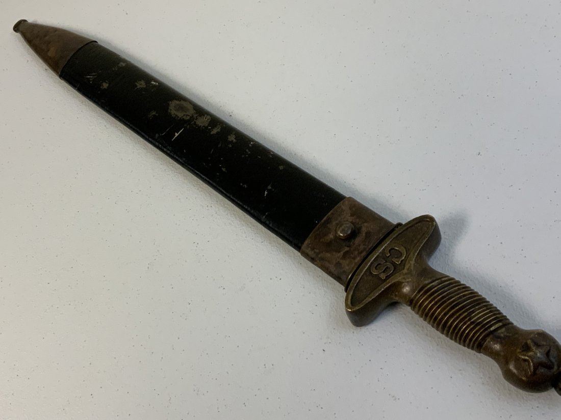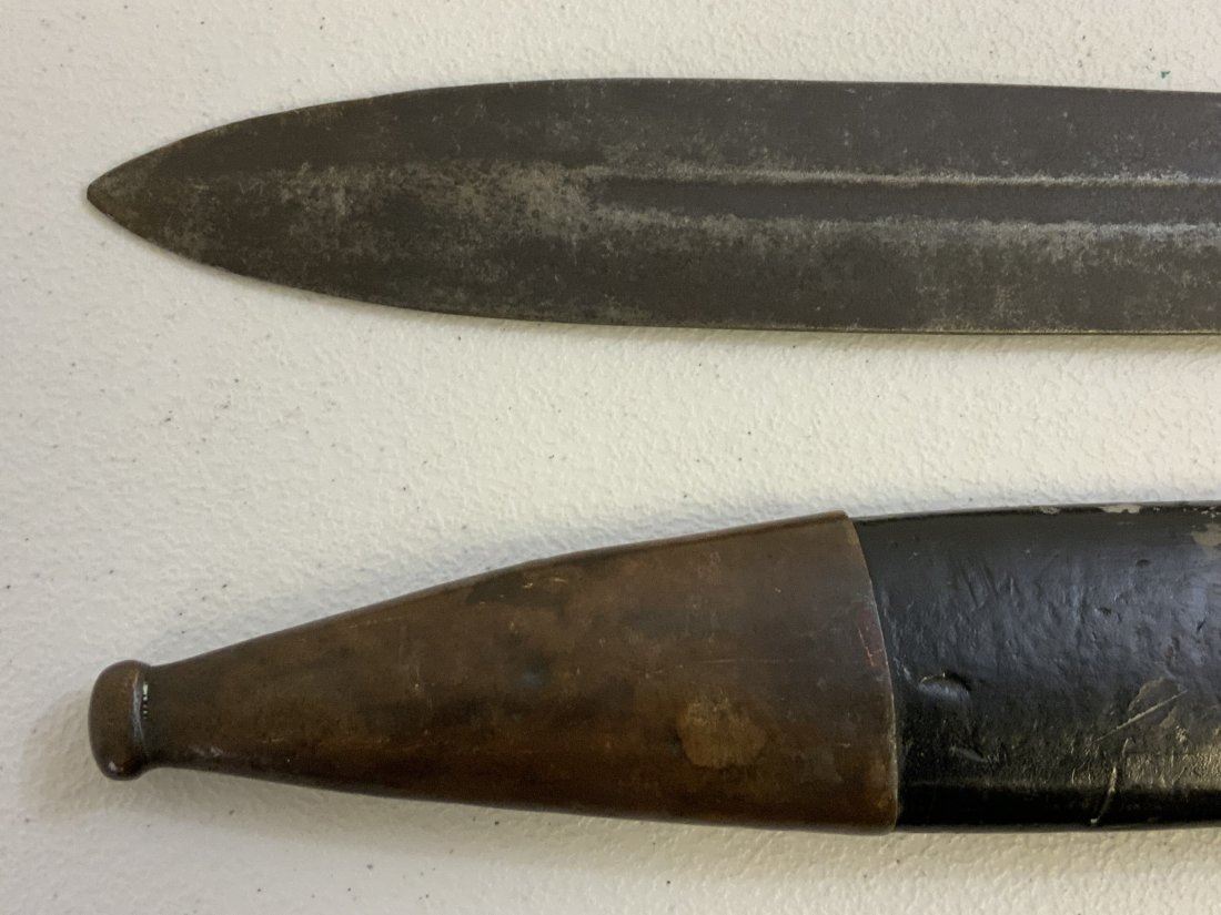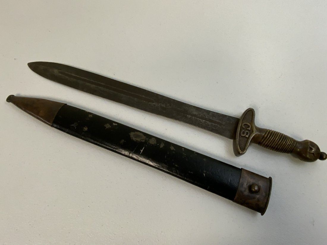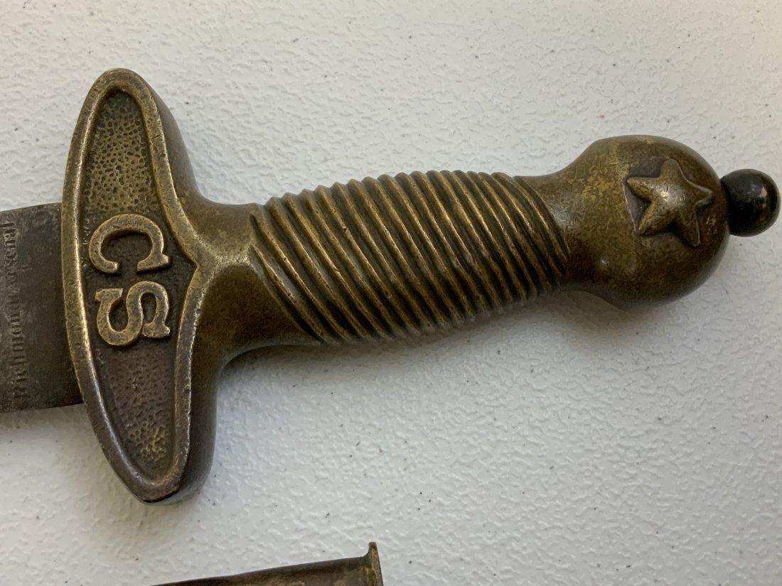 CS TEXAS STAR RICHMOND ARSENAL CONFEDERATE SHORT SWORD. DISPLAYS GREAT AGE AND PATINA . LEATHER SHEET WITH BRASS FITTINGS. NICE WIDE BLADE WITH RICHMOND ARSENAL MARK. BELIEVED TO BE A POST WAR PRODUCTION SWORD . GREAT FOR DISPLAY OR REENACTMENT. 28" LONG WITH 19.5" LONG BLADE .