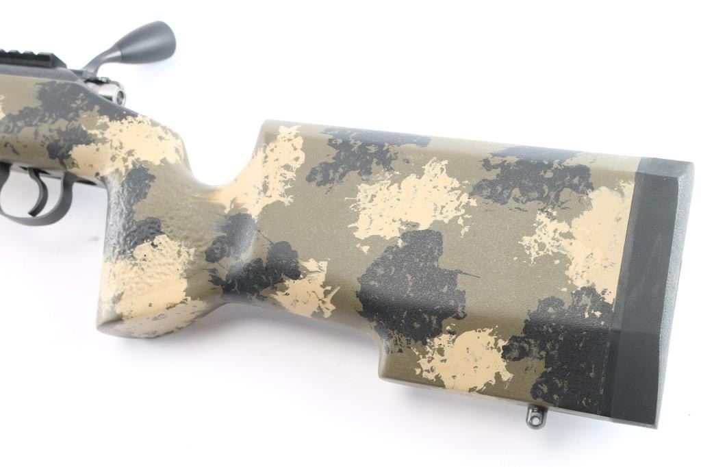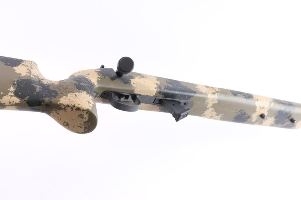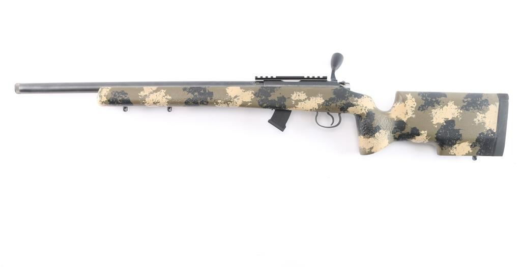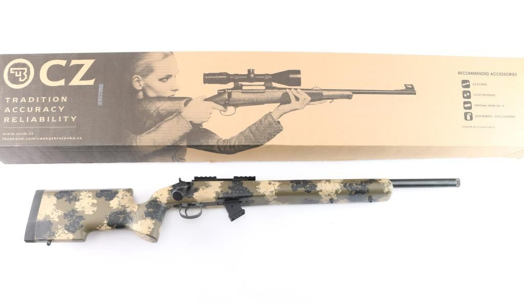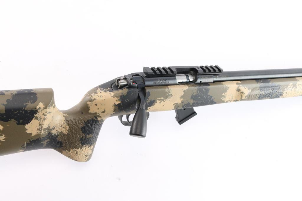Optics ready Czech bolt action rimfire rifle in 22 Long Rifle, imported by CZ-USA, Kansas City KS. Features a. 20.1/2 inch threaded barrel with no provisions for sights, multi-slot scope base installed, swept-back bolt handle with oversized polymer knob, detachable 10 rd magazine,manual safety. Camo Manners Composite T4 stock Bore is excellent. Retains 99% dark blue. Stock is excellent. like new condition. Comes in original factory box with matching label, factory bolt handle, manual, factory 5-rd magazine and a Rifle Basix CZ-52 High Quality replacement trigger. (Retail for about $100.00)