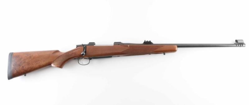 Czech bolt action rifle imported by CZ USA, Kansas City KS. Features blued finish, fancy figured walnut stock with right handed cheekpiece, checkering at wrist & forend, solid rubber recoil pad, 25" barrel, muzzle brake cuts into barrel, hooded blade front sight, express rear sight island with one standing and two folding leaves, receiver dovetails for scope mounts (no mounts included), hinged floorplate, sling studs, manual safety. Bore is very good condition. Retains 90% finish with bare metal at rub spots on barrel & floorplate. Stock is very good condition with several gouges to forend. Condition is NRA Very Good++ *** Modern Firearm ***