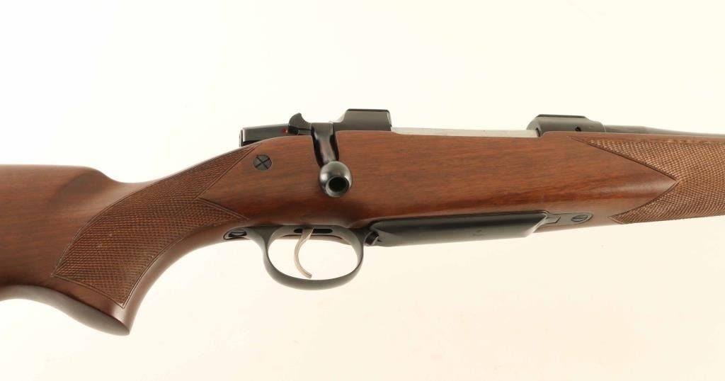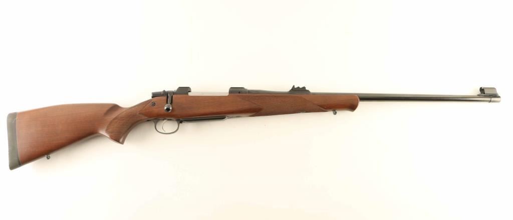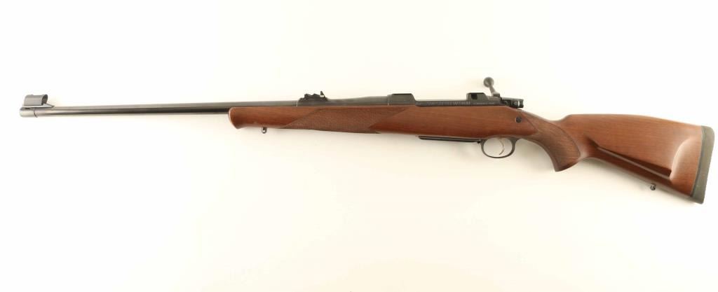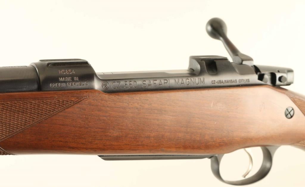 Czech bolt action rifle imported by CZ USA, Kansas City KS. Features blued finish, wood stock with right handed cheekpiece, curved European style comb, checkering at wrist & forend, solid rubber recoil pad, 25" barrel, hooded blade front sight, express rear sight island with one standing and two folding leaves, receiver dovetails for scope mounts (no mounts included), hinged floorplate, sling studs, manual safety. Bore is excellent. Overall condition is near excellent, with some small dings & scuffs. Caliber marking on barrel is altered to reflect current chambering, with "ULTRA MAG" cleanly lettered inside a small machined oval. Condition is NRA Very Good++ *** Modern Firearm ***