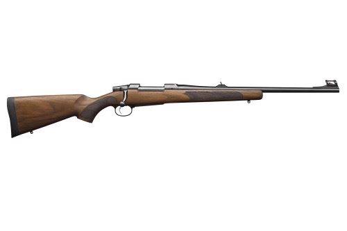Carbine model combines the quick handling characteristics of a shorter barreled rifle with the benefits of back up iron sights. This is the preferred configuration of many professional hunters. The Carbine has a fiber optic front sight and an oil-finished walnut stock with cheekpiece.