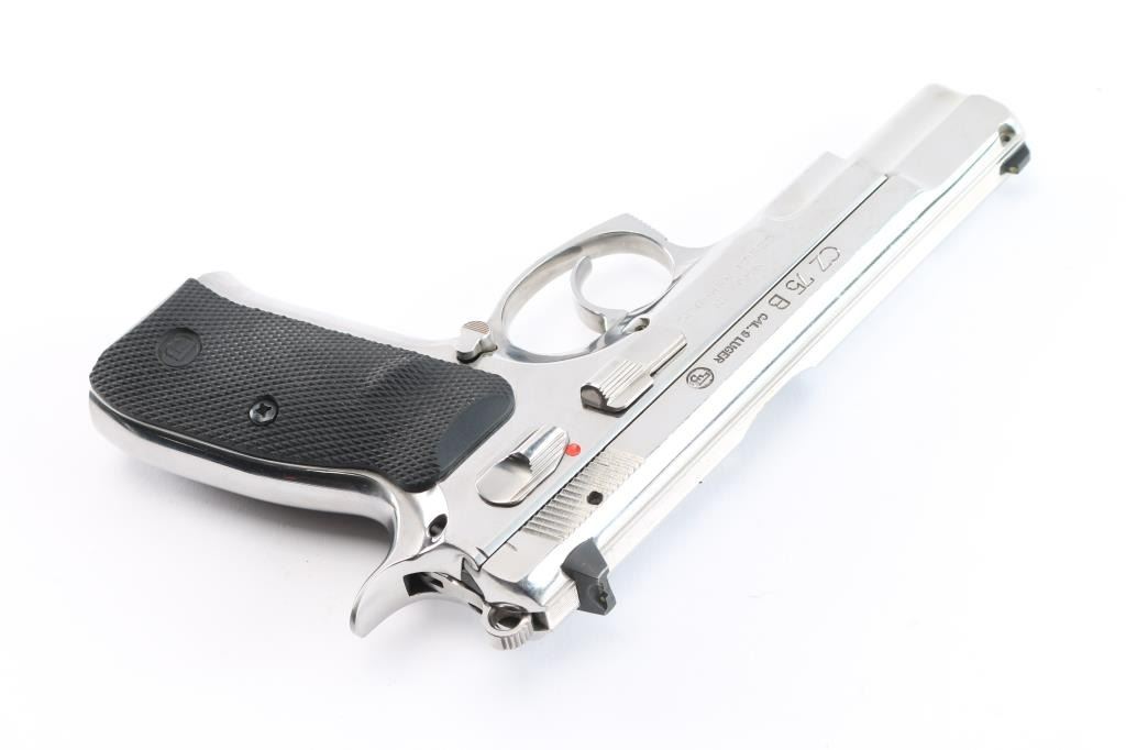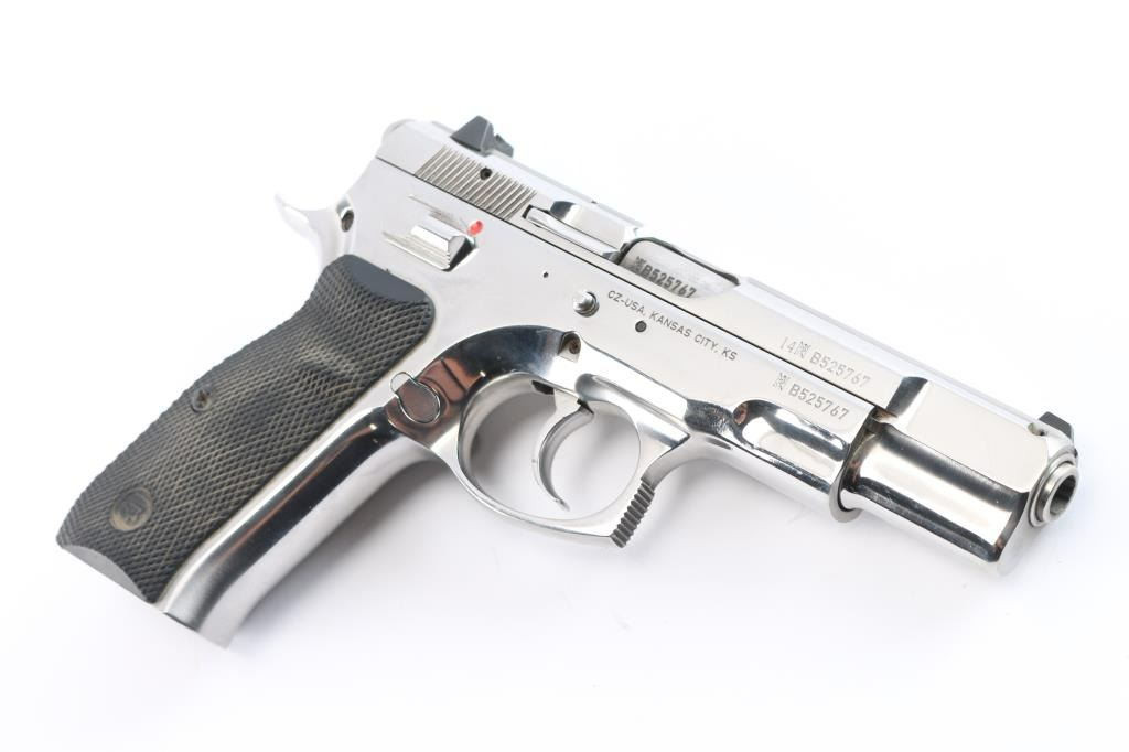Czech made DA/SA semi-automatic pistol chambered in 9x19mm. Imported by CZ-USA of Kansas City, K.S. with import marks on the right side of the frame. Features a gloss nickle finish, 4.5" barrel, three-dot sights with drift adjustable rear sight, smooth silver look trigger, serrated round hammer spur, frame mounted safety, steel frame, push button magazine release, two-piece checkered black rubber grips with CZ insignias. Bore is very good. Retains 95% finish, with minor handling marks and light scratches. Grips show some dirt, overall very good condition. No magazine, but has a standard 15 rd capacity. Numbers match on frame, slide, barrel.
