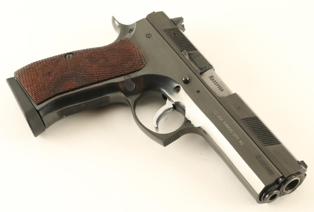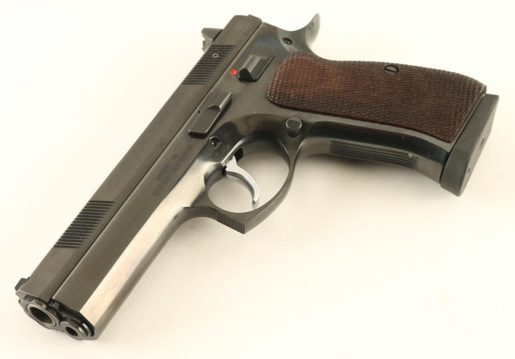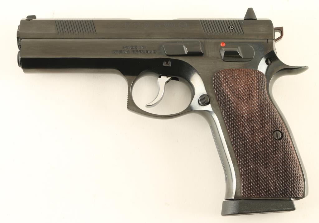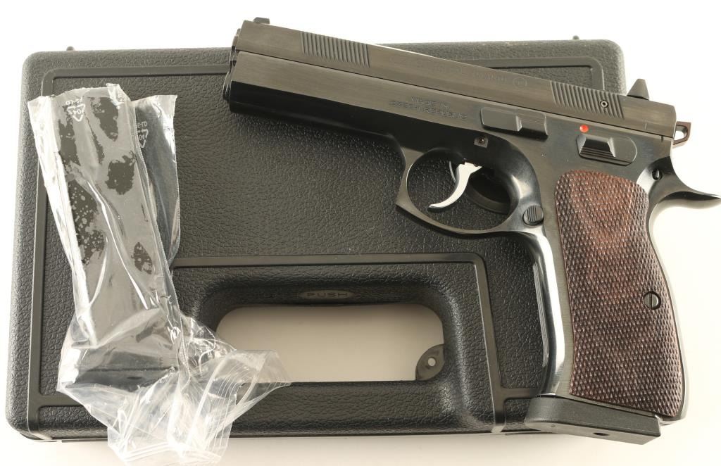 Czech semiautomatic double/single action pistol imported by CZ USA, Kansas City KS. Features blued finish, checkered wood grips, 4.5" barrel, 3 dot sights in dovetails, frame mounted manual safety, loaded chamber indicator. Overall condition is like new with few signs of handling. Numbers match on frame, slide, barrel. Includes (2) magazines total,cleaning rod, barrel bushing wrench, manual, factory plastic case with cardboard outer sleeve. Condition is NRA Excellent - like new *** Modern Firearm ***