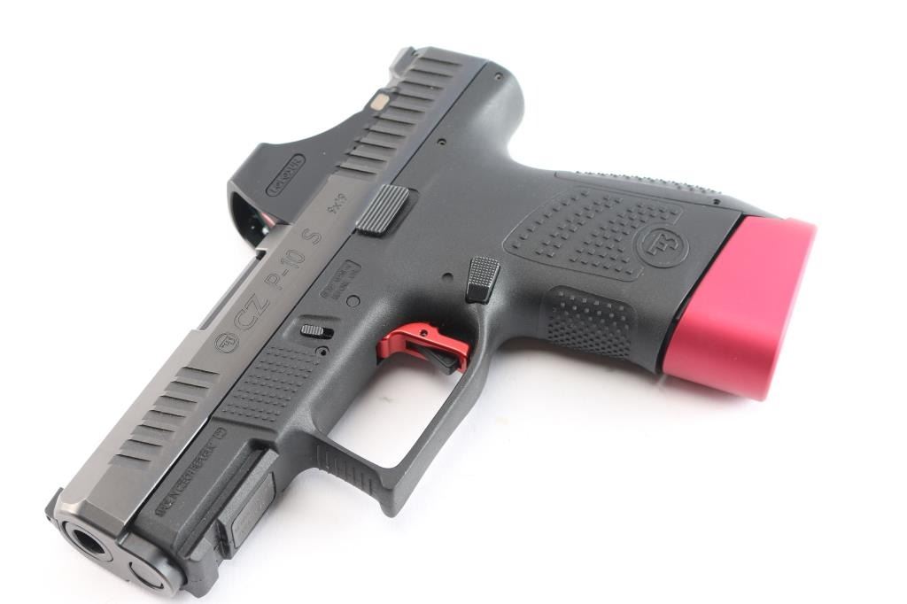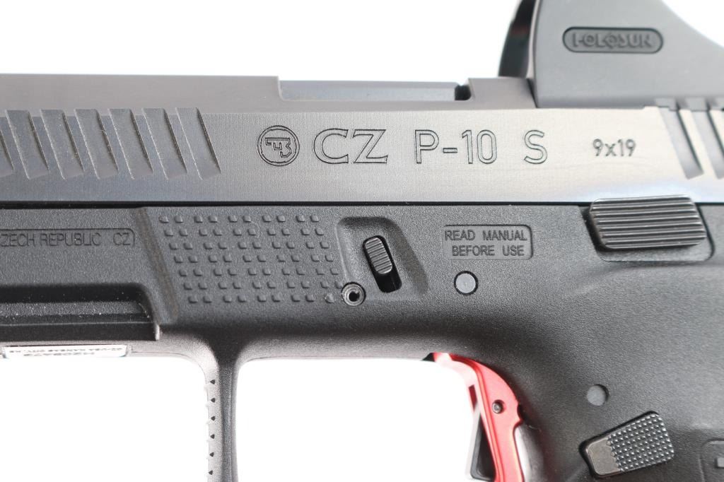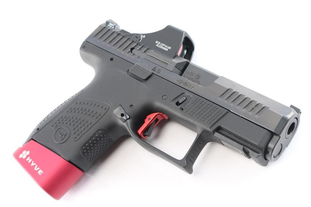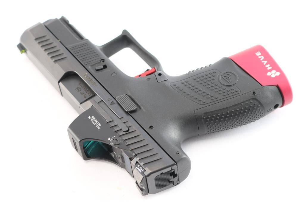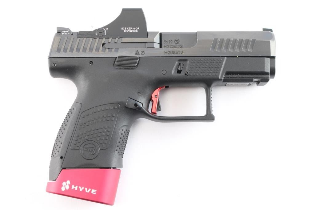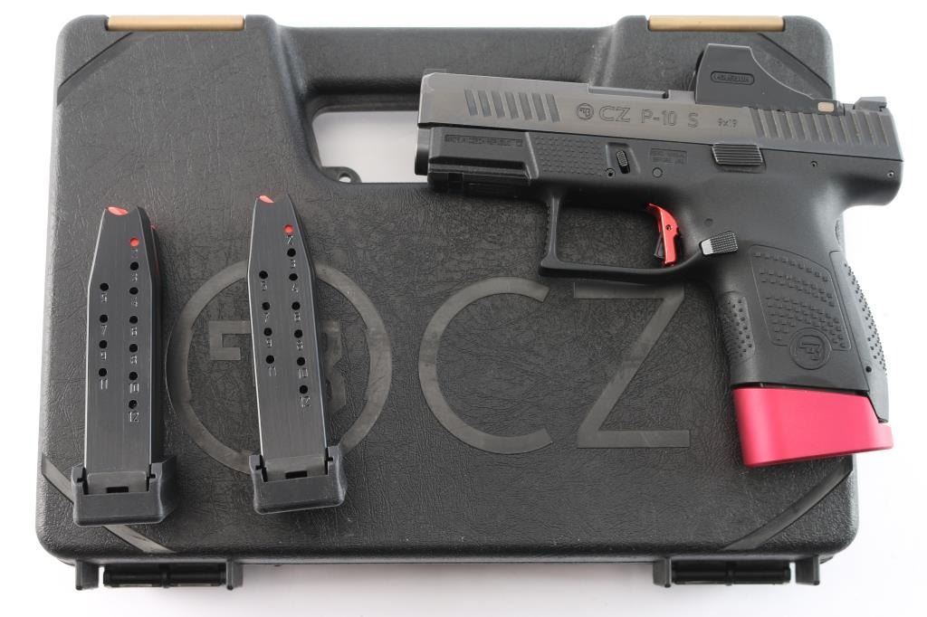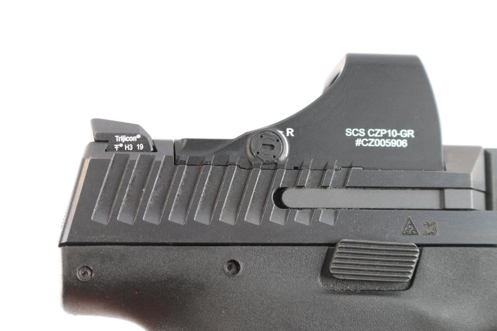 Czech made striker fired semi-automatic sub-compact pistol chambered in 9x19mm. Features a black nitrided slide with fore & aft cocking serrations, 3.5" cold hammer forged barrel, full-length steel guide rod, dovetailed three-dot Trijicon night sights, installed Holosun SCS green dot sight, red Apex trigger, firing pin block safety, ambidextrous slide catch lever, reversible push button magazine release, factory 12 round magazine with Hyve extension, and fiber-reinforced FDE polymer frame with integral accessory rail, textured grip & interchangeable backstraps. Includes the original factory hard case with documents, lock, snap cap, two spare 12 round magazines, cleaning rod, cleaning brush and additional backstraps. Pistol retains approximately 99% of its original finish showing only minor edge wear. Action is crisp, the bore is pristine, optics are clear, and the polymer is excellent.