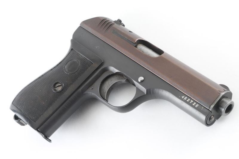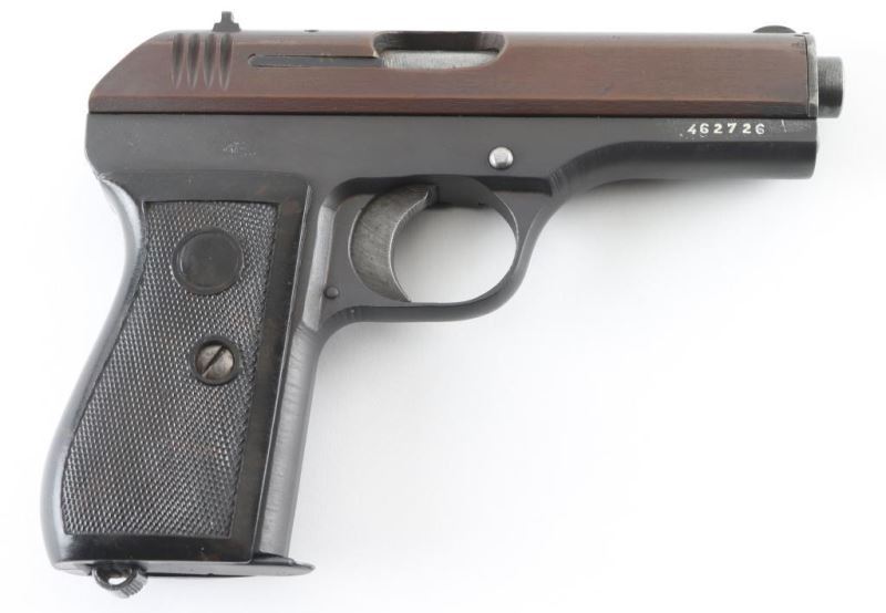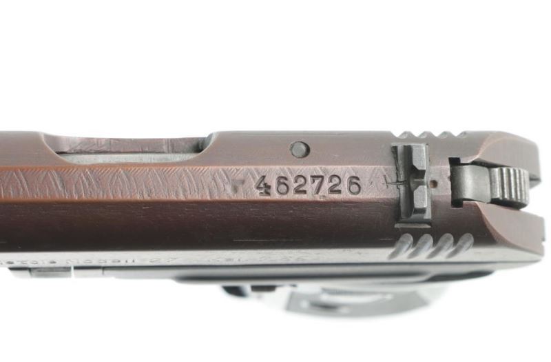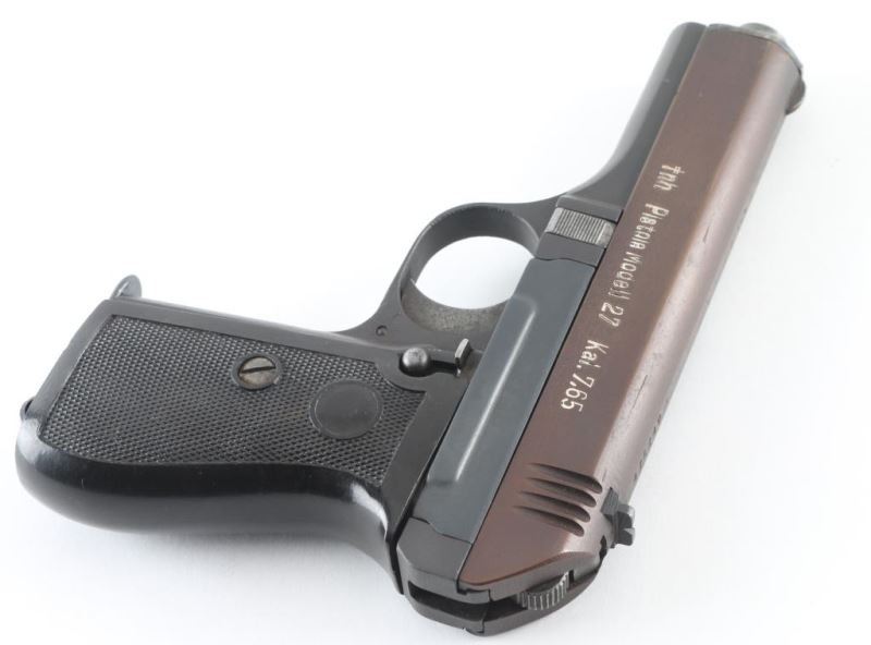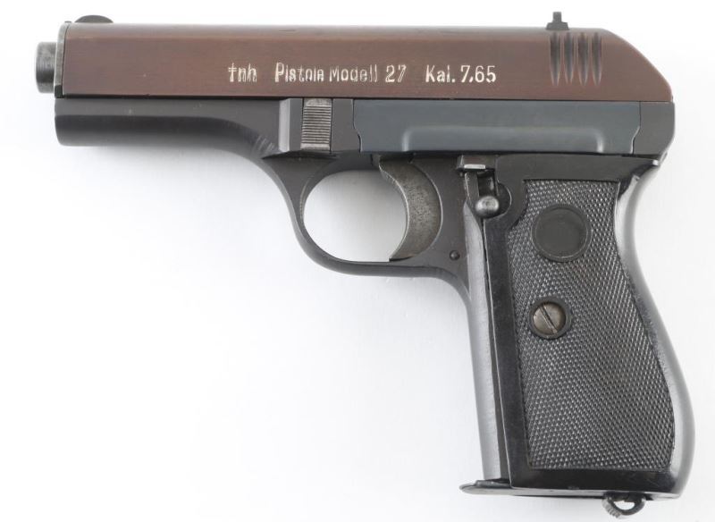 Pistol. Semi-Automatic. 8 rd Magazine. Blowback action, 3.9" barrel. Issued to German Military/Police. Czech vz. 27 made under German occupation during WW2, under Bohmische Waffenfabrik (fnh). Left slide stamped "fnh Pistole Modell 27 Kal 7.65". (Double stamped) Serial numbers match on frame and slide .Eagle/swastika proofs on slide and barrel. Faint waffenamt on right frame. Plum colored slide, appears refinished. Gray parkerized frame. Brown plastic grips. Bore appears very good/bright. Grips are very good. Metal has some minor scratches/edge wear. Magazines floorplate is stamped "P. Mod 27". NRA condition-Good. C&R Firearm.