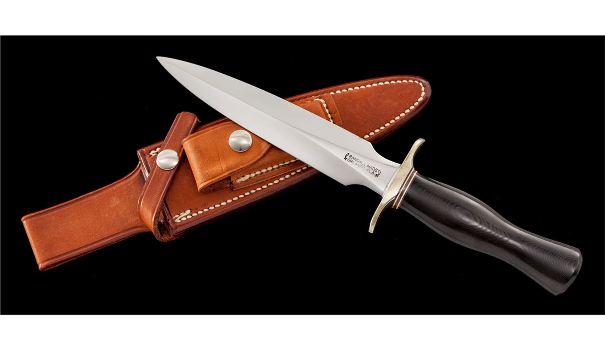Circa 1970s Randall Model 2 ''Fighting Stiletto'', 6'' blade marked ''RANDALL MADE/ORLANDO, FLA.''; 10-5/8'' overall length, black micarta commando style handle, nickel silver full guard, with five multi-colored spacers (four thin and one larger gray center spacer). Johnson roughback sheath stamped with the ''Randall'' football shaped logo and ''2 6'' on the back side of the belt loop, smooth snaps, and unmarked salmon colored sharpening stone. Condition is fine to near excellent overall. Blade retains the original edge with light fine micro-scratching. Guard with moderate discoloration and toning due to prolonged contact with leather sheath. Sheath with light scuffs and scratches; stitching and seams remain tight. Sharpening stone is unused with small amounts of verdigris present. Est.: $450-$650. (Ian Shein estate)