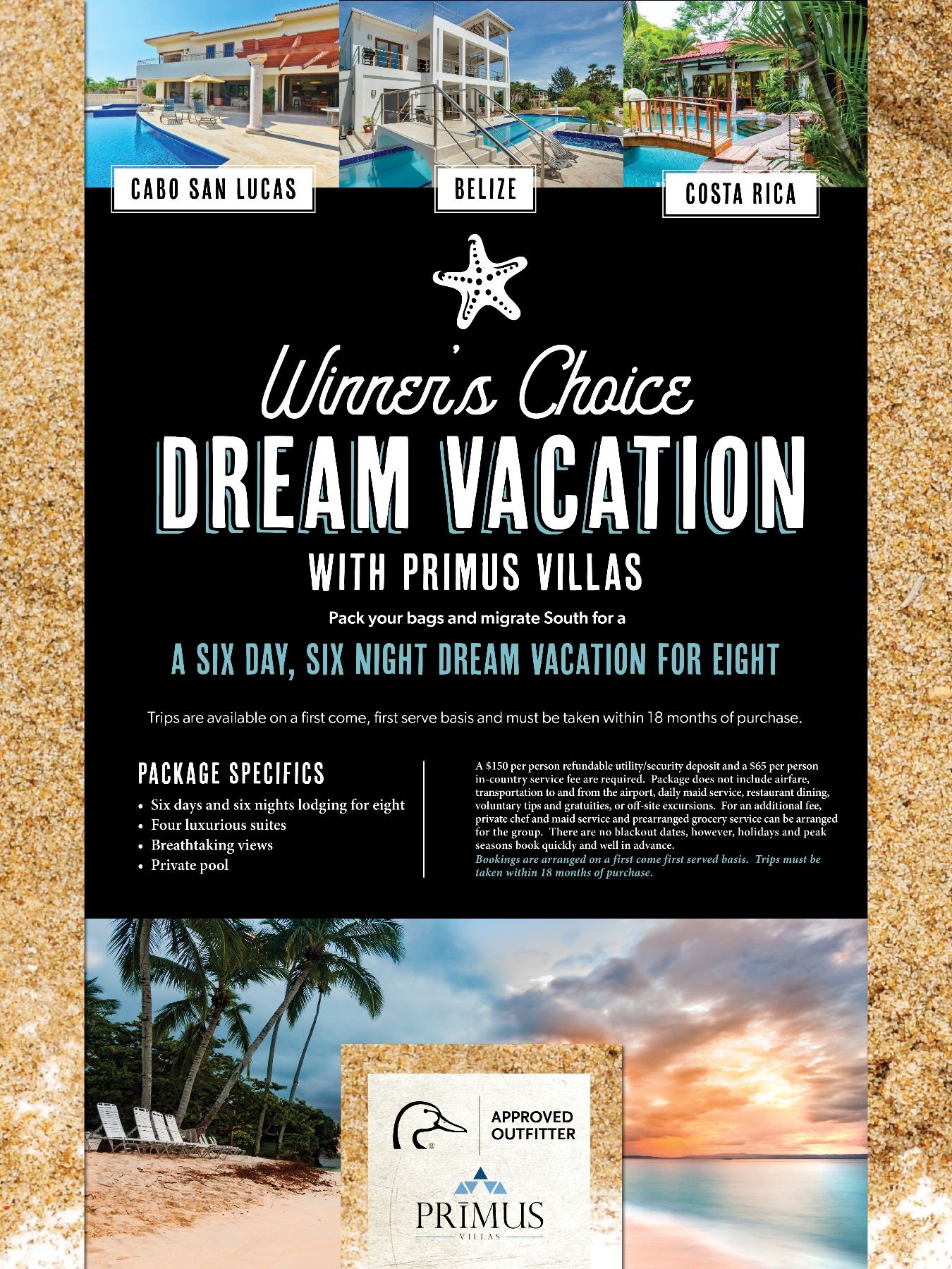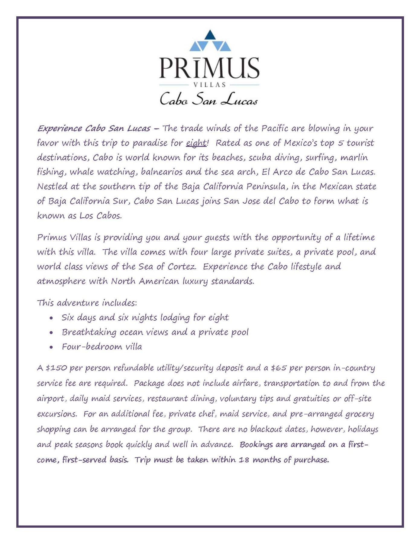 The trade winds of the Pacific are blowing in your favor with this trip to paradise for eight! Rated as one of Mexico’s top 5 tourist destinations, Cabo is world known for its beaches, scuba diving, surfing, marlin fishing, whale watching, balnearios and the sea arch, El Arco de Cabo San Lucas. Nestled at the southern tip of the Baja California Peninsula, in the Mexican state of Baja California Sur, Cabo San Lucas joins San Jose del Cabo to form what is known as Los Cabos. Primus Villas is providing you and your guests with the opportunity of a lifetime with this villa. The villa comes with four large private suites, a private pool, and world class views of the Sea of Cortez. Experience the Cabo lifestyle and atmosphere with North American luxury standards. Includes: Six days and six nights lodging for eight. Breathtaking ocean views and a private pool. Four-bedroom villa. Not Included: $150 per person refundable utility/security deposit. $65 per person in-country service fee are required. Airfare and transportation to and from the airport. Daily maid services, Restaurant dining and beverages, Voluntary tips and gratuities, Off-site excursions. For an additional fee, private chef, maid service, and pre-arranged grocery shopping can be arranged for the group. There are no blackout dates, however, holidays and peak seasons book quickly and well in advance. Bookings are arranged on a first-come, first-served basis. Trip must be taken within 18 months of purchase.