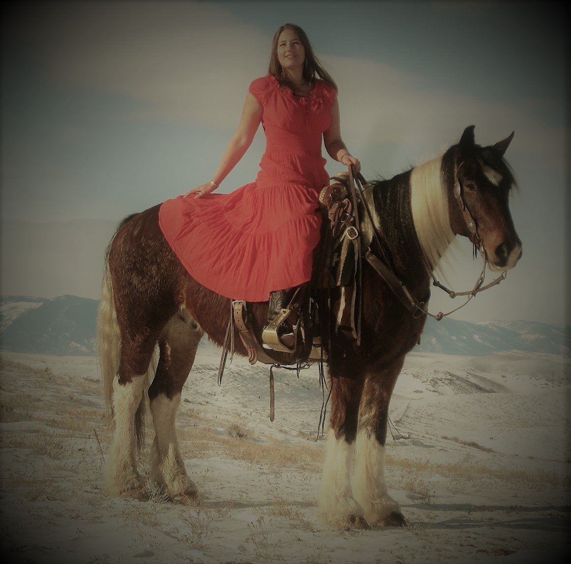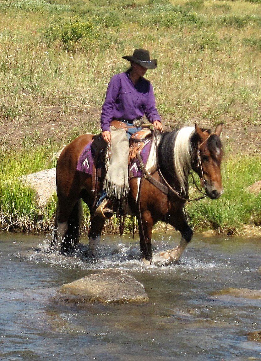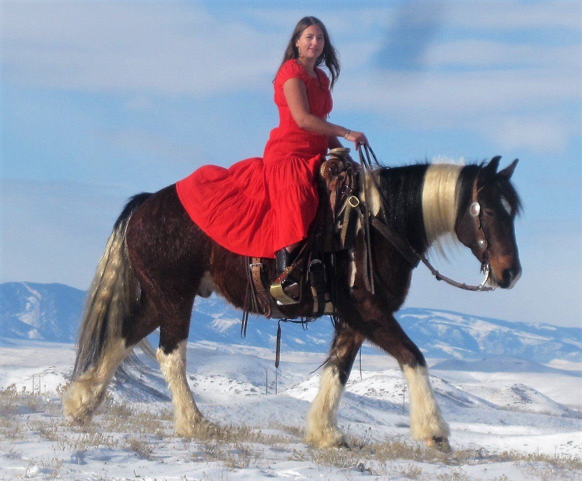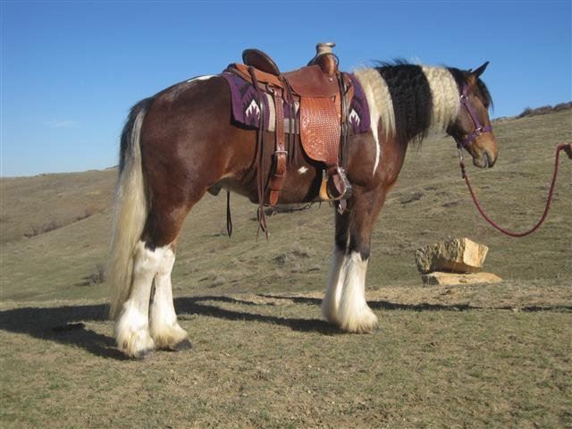 Meet Calico! He is an amazing horse, with a one of a kind personality, great disposition and lots of good looks! I like him a alot!! Calico is a Gypsy/Frisian/Quarter Horse cross gelding! He is right in the prime of his life at 5 yrs old and stands a perfect height of 15.1 hands tall. He is a very talented horse and has been ridden both english and western and is also broke to drive single. He was used all last summer on a grazing permit in the Big Horn Mountains and it is hard to find anything on the mountain trail that he hasn't seen! He walks out with a nice paced walk on a loose rein and will go over and across anything you point him at. He will neck rein and be easy to maneuver through all kinds of terrain. Calico is also hobble broke and has been high lined. Calico loves cattle work and shows a lot of natural talent for that. He will be there for you all day pushing cattle on the ranch, and will pin his ears and track them around the arena as well. He has also had cattle roped and drug off him. He has also been ridden and driven along the highway and is traffic broke. He has also been used for flagging and roping colts in the arena and ponying colts on out side rides. This horse also rides great in the arena. He will pick his leads from a stand still and pick up a nice little lope. He is soft in the mouth and ribs and responds lightly to all cues. He has nice turn arounds and sidepasses, backs and stops with ease! You can carry flags on him, drag anything you want, flop your tarps and crack you bull whips, you name it! Calico also loves to play with and push the big bouncy ball around. Calico has been ridden by all levels of riders and is a very patient and forgiving type of horse. He has athletic ability and will really ride around nice and handy and be a lot of fun, but then yet be gentle, quiet, calm and easy to ride. He was the horse we choose to take care of Christinas sister all last summer in the mountains when she was visiting from Denmark. We never had to worry about her. Calico is a people loving horse. He is always the first to come up to you in the corral and the last to leave you when the other horses takes off. Always easy to catch and he has great ground manners. He is good to shoe, loves a bath, loads well, is a breeze to clip, good with other horses and is an over all joy to be around, have around and ride. Calico should make just about anybody a great friend and partner. I can't imagine anybody not liking him. He is absolutly willing in everything you ask him to do, and stunning to look at as well. Here is your chance to own a super nice draft cross gelding, with a long thick mane and tale, feathered legs, big bone and feet, lots of fancy color, in a manageable size and with a fantastic personality. I could keep writing about this horse all day, but instead, please give us a call anytime 307-752-8197 or come see us at the sale. I would love to tell you more about him! New updated sale video will be available on our website about a month prior to sale date, so please check that out. www.WyomingHorsesAndMules.net