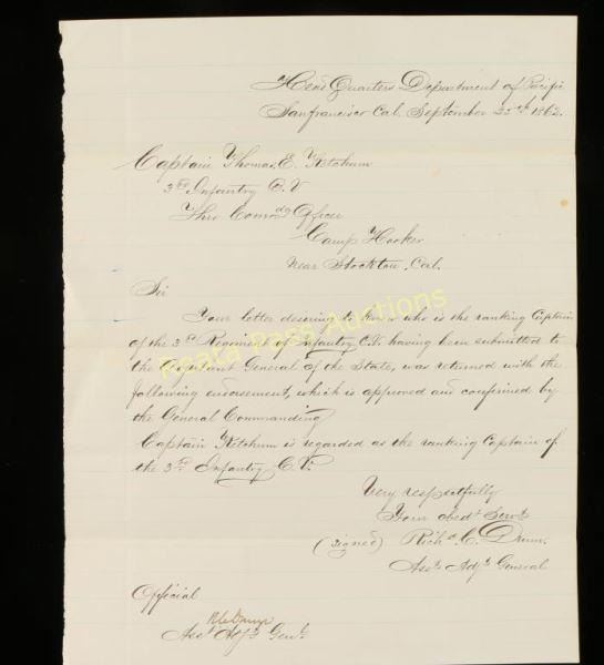 Dated September 25th, 1862 to Captain Thomas E Ketchum answering his inquiry on who was the ranking Captain of the 3rd Regiment ot Infantry C.V.