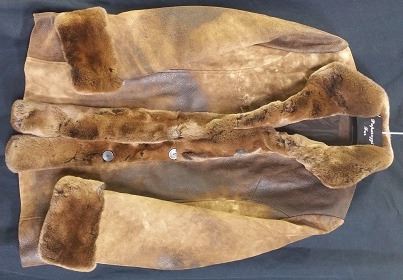 Camel break leather jacket w/ rex rabbit dyed camo trim, women's medium