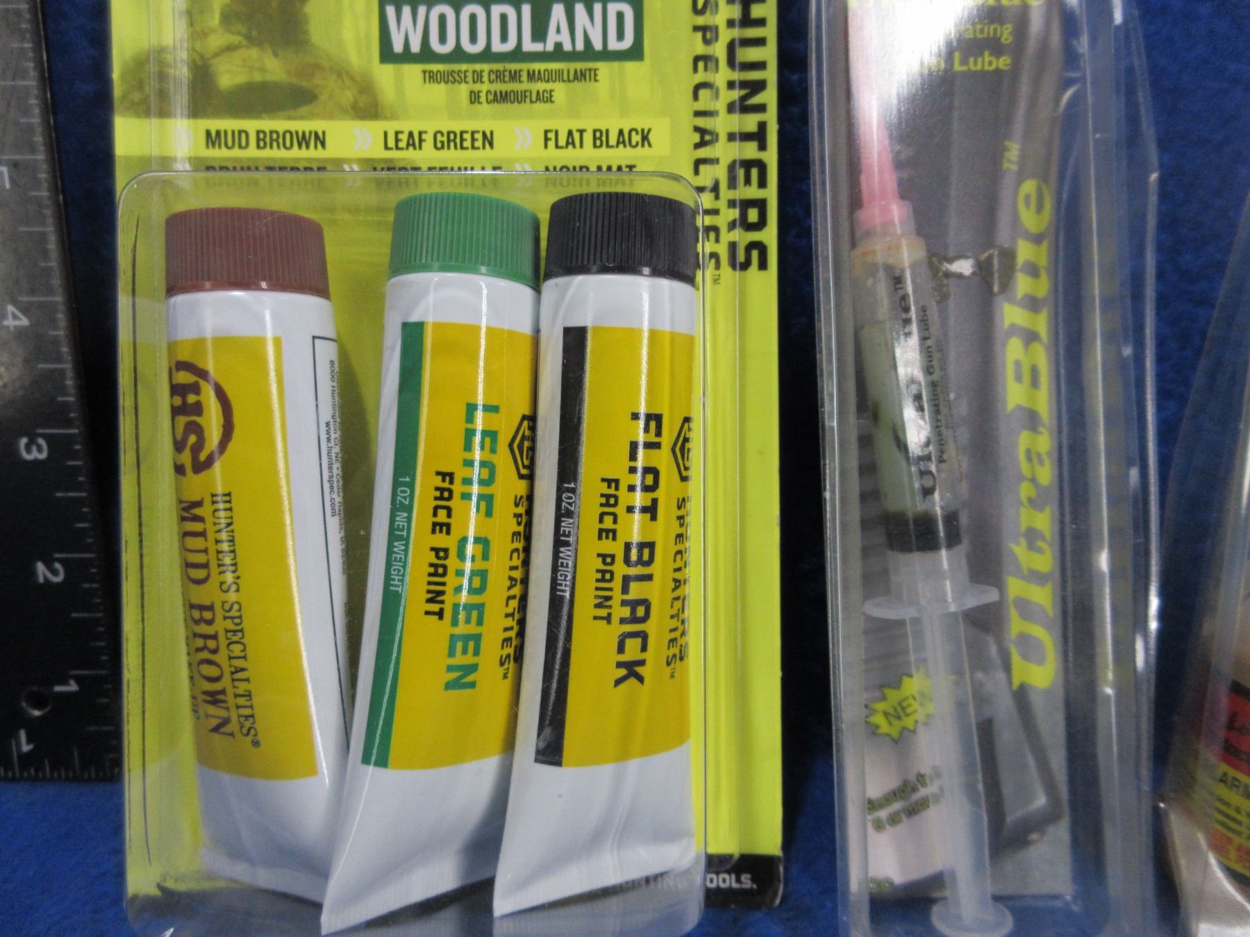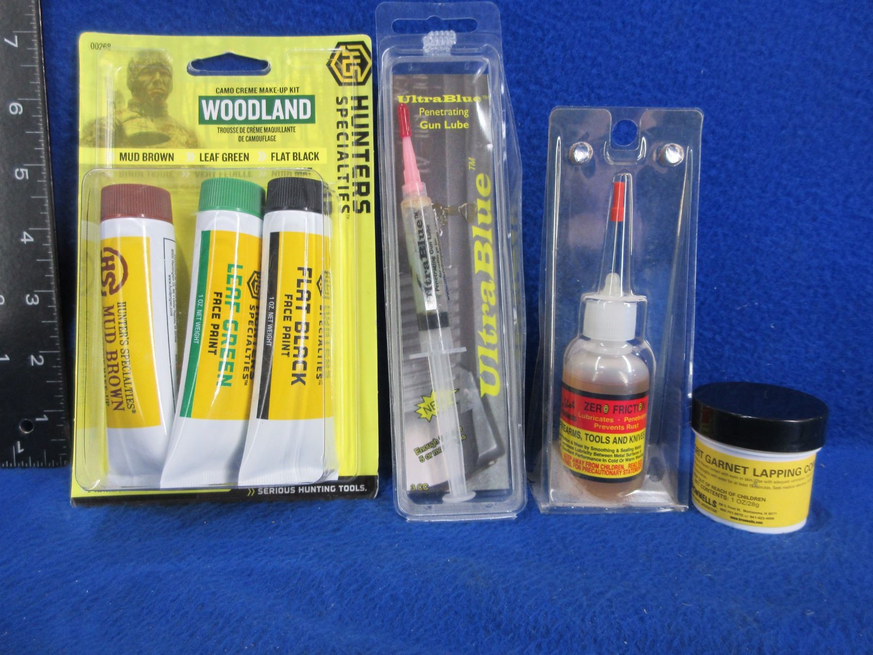 Woodland Camo Crème, Zero Friction Lube, Barnells 800 Grit Garnet Lapping Compound, Ultra Blue