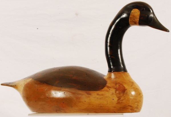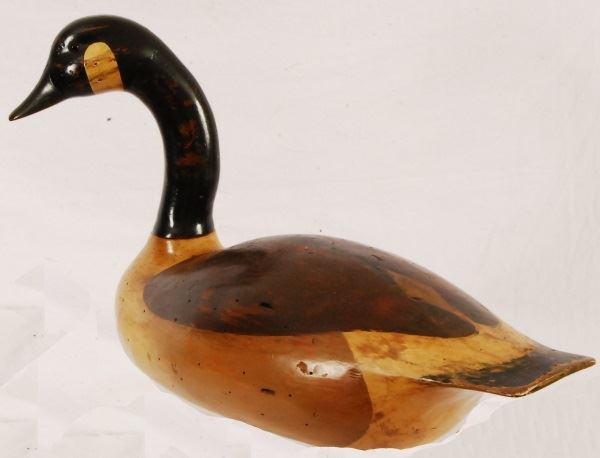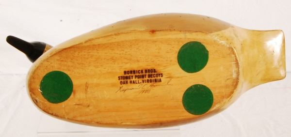 Canada goose wood decoy. 23" long. Finely painted. Removable head. Made and signed by Raymond Hornick of Hornick Bros. Stoney Point Decoys, Oak Hall, Virginia.