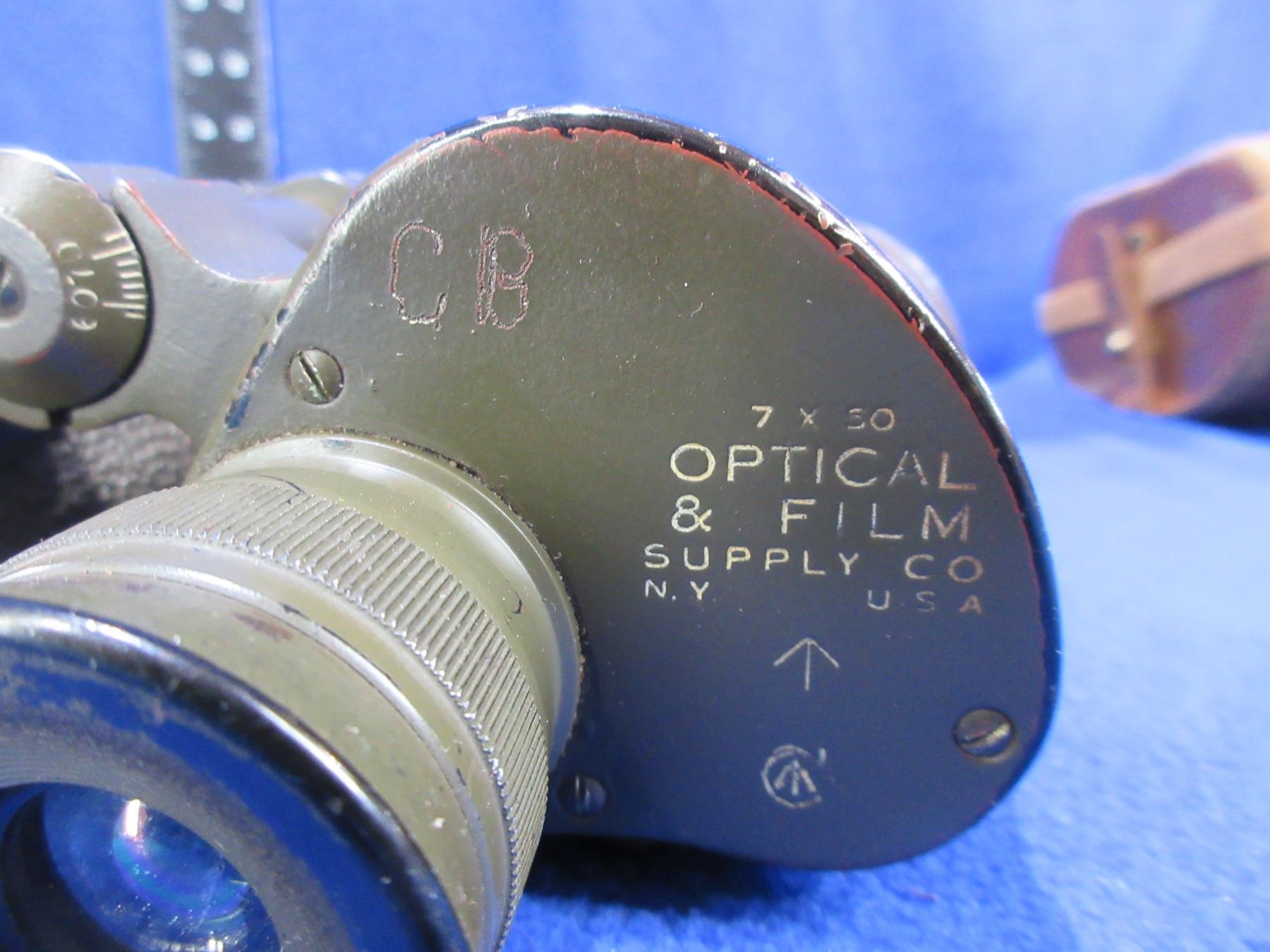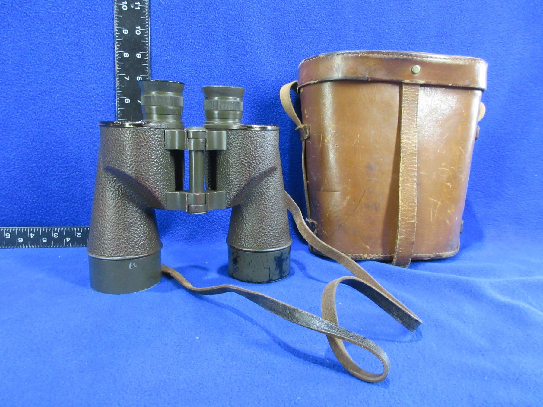 Canadian Military 7x50 Binoculars with Leather Case - Has Broad Arrow Marking - 1 objective lens is damaged (frosted)