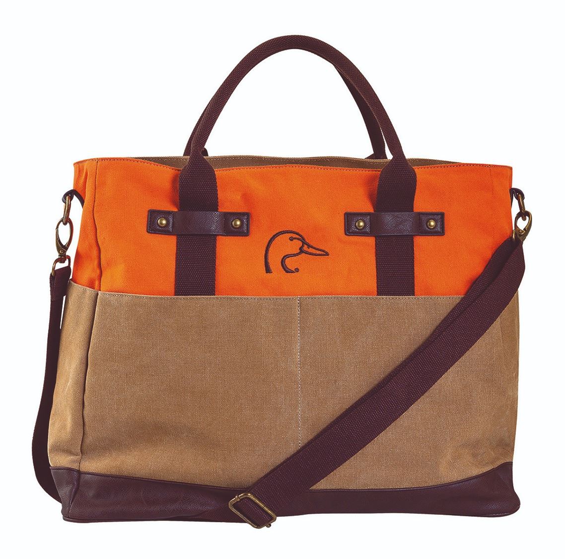 Perfect complement to the 2 Piece Club Chair Set. This orange and tan canvas tote includes a large interior compartment with two pockets, two front outer pockets, two side pockets, a shoulder strap, and faux leather trim. The bag features DU logo embroidery.