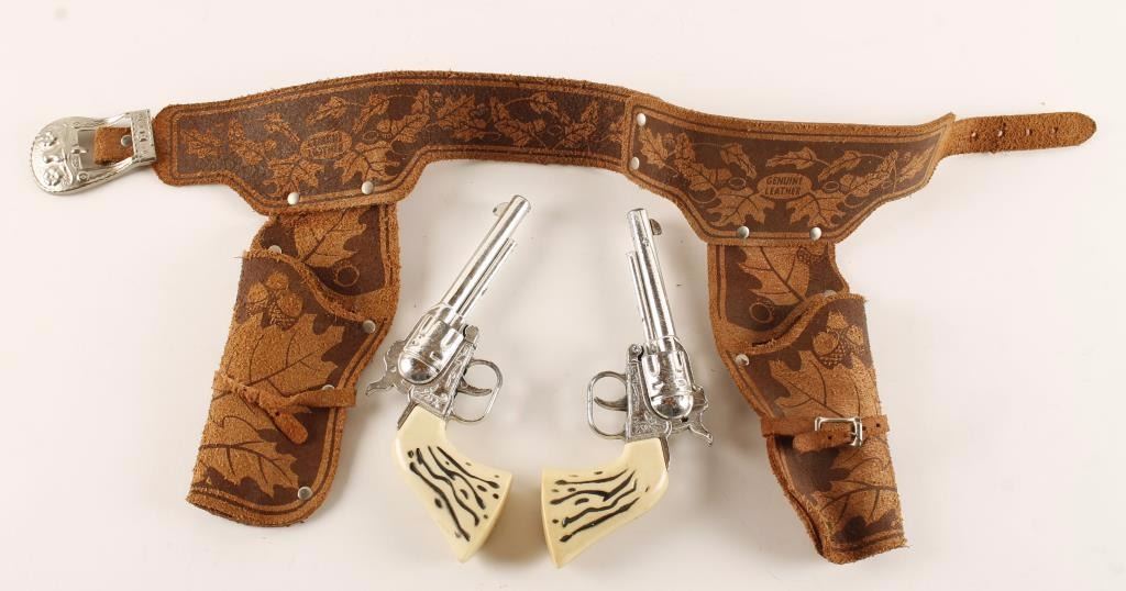 Cap gun set including 2 cap guns and holster belt. Cap guns have minor loss of plating, actions work well, but are not marked. Holster belt is in good condition-missing one buckle on one holster decoration.