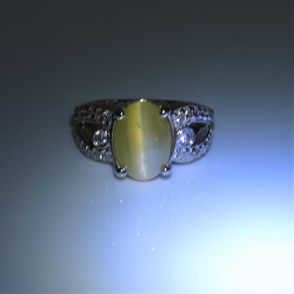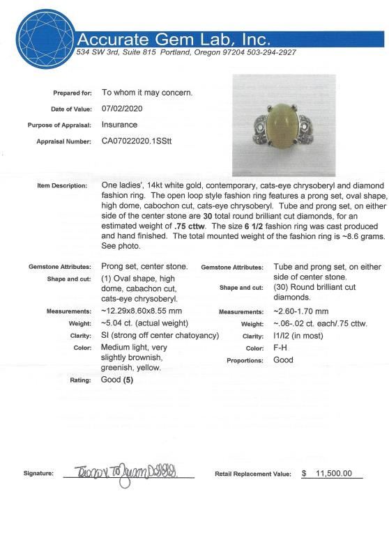 featuring a Honey colored Chrysoberyl cabochon weighing 5.06 carats accented with 30 round cut Diamonds weighing approx. 0.60 carats with F-G colors and SI clarity set in 14 karat white gold. Full Appraised Value $10,000.00