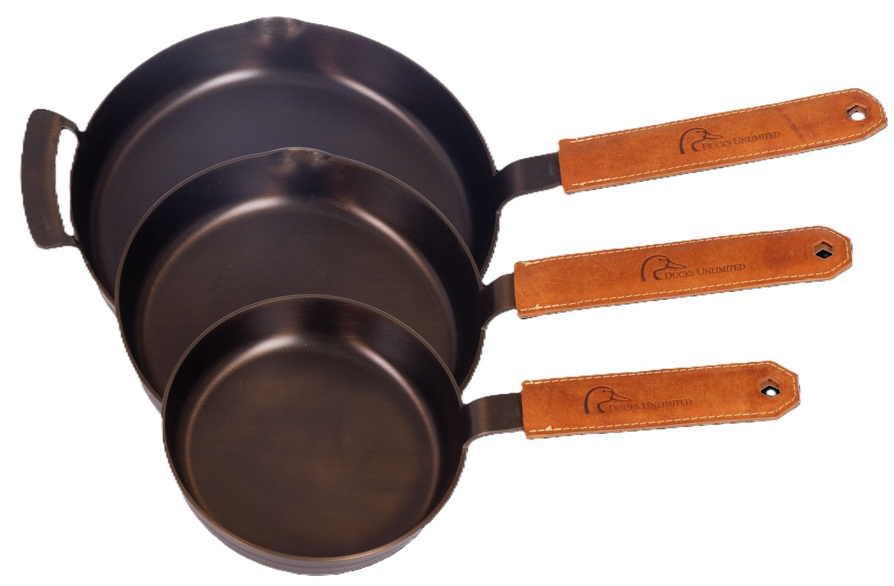 The Carbon Steel Pan Set with leather sleeves is a must-have addition to any kitchen, combining functionalitywith distinctive style. This 3-piece set includes skillets in three sizes: 8 inches, 10 inches, and 12 inches, eachaccompanied by a custom leather sleeve featuring the Ducks Unlimited logo. The pans are adorned with theduckhead logo on the handle, while the bottom proudly displays the co-branded Cast-A-Way logo. Arriving pre-seasoned, these skillets are ready to use immediately, requiring no additional preparation. Crafted with qualityin mind, these pans are proudly made in the USA, ensuring durability and superior cooking performance foryears to come.