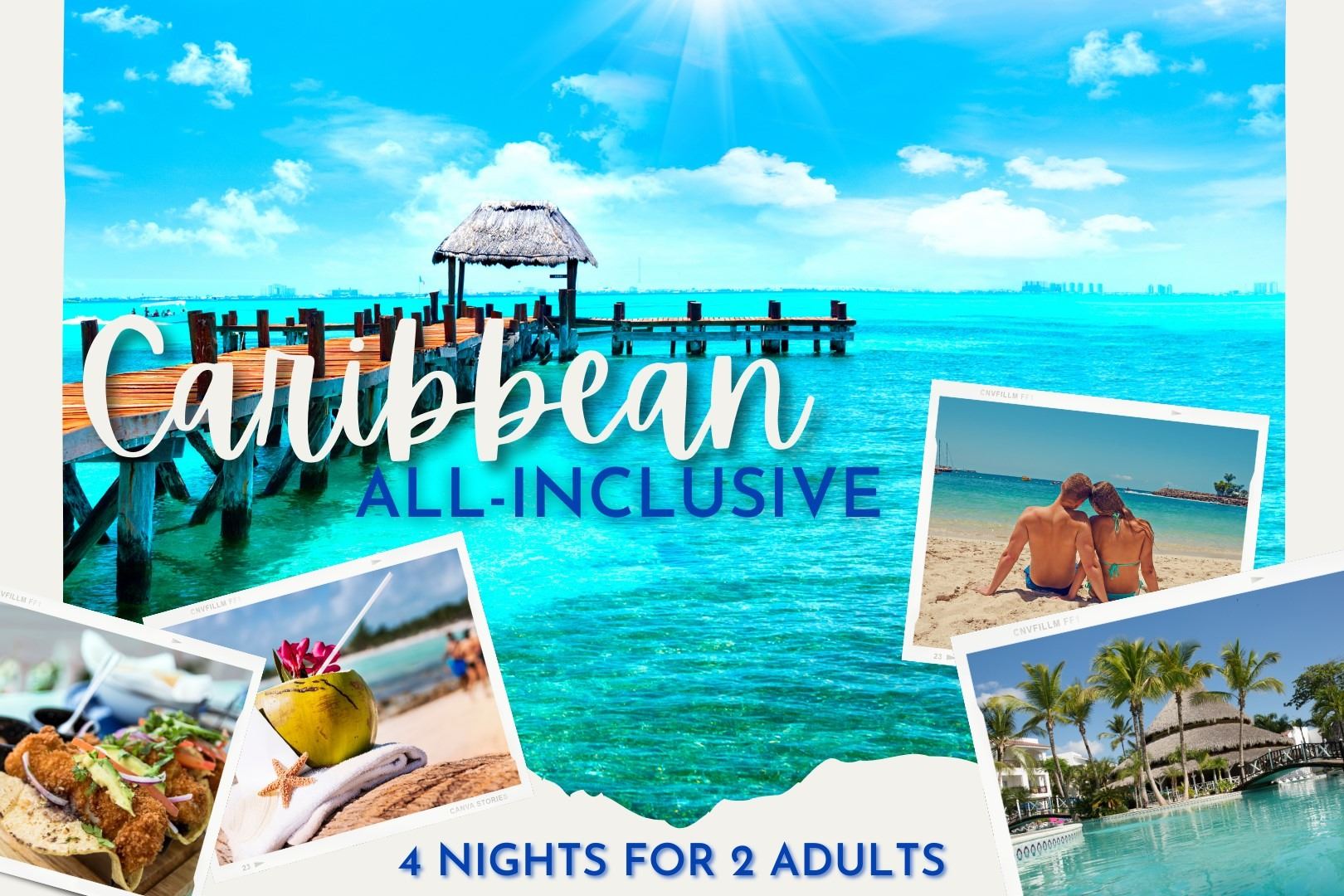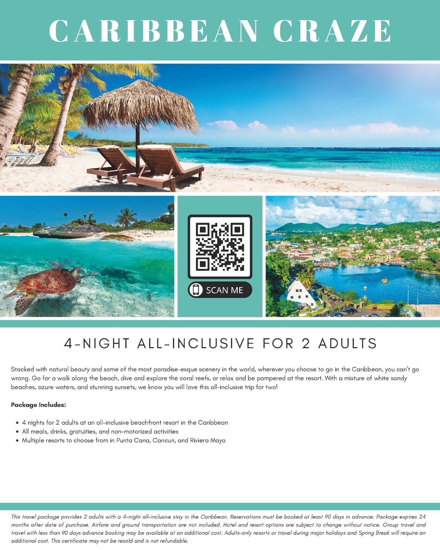 Stacked with natural beauty and some of the most paradise-esque scenery in the world, wherever you choose to go in the Caribbean, you can't go wrong. Go for a walk along the beach, dive and explore the coral reefs, or relax and be pampered at the resort. With a mixture of white sandy beaches, azure waters, and stunning sunsets, we know you will love this all-inclusive trip for two! Package Includes: 4 nights for 2 adults at an all-inclusive beachfront resort in the Caribbean. All meals, drinks, gratuities, and non-motorized activities. Multiple resorts to choose from in Punta Cana, Cancun, and Riviera Maya. Terms and Conditions: This travel package provides 2 adults with a 4-night all-inclusive stay in the Caribbean. Reservations must be booked at least 90 days in advance. Package expires 24 months after date of purchase. Airfare and ground transportation are not included. Hotel and resort options are subject to change without notice. Group travel and travel with less than 90 days advance booking may be available at an additional cost. Adults-only resorts or travel during major holidays and Spring Break will require an additional cost. This certificate may not be resold and is not refundable.