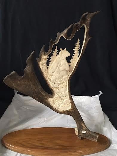 Lot 30: Caribou Shovel Horn Carving of a Grizzly Bear - Alaska Horn and Antler - Long Time supporter Tom Cooper has donated Caribou shovel Horn Carving with Bear design by Alaska Horn Carving Artist, Don Conners