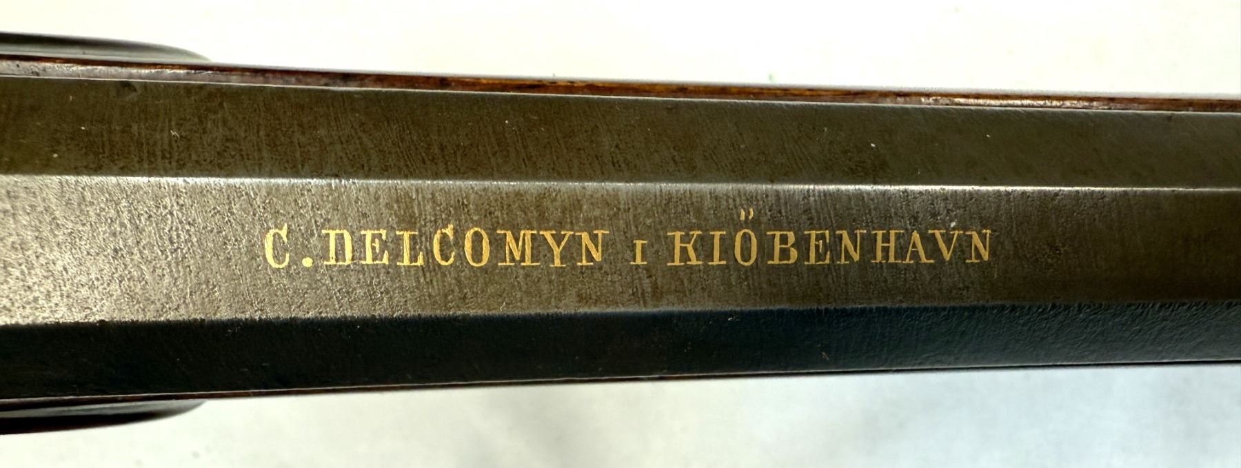 Top of barrel is marked in gold .C. Delcomyn i Kiobenhavn.. also has gold lines