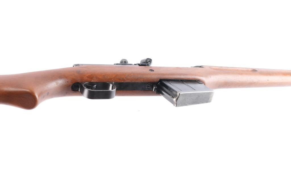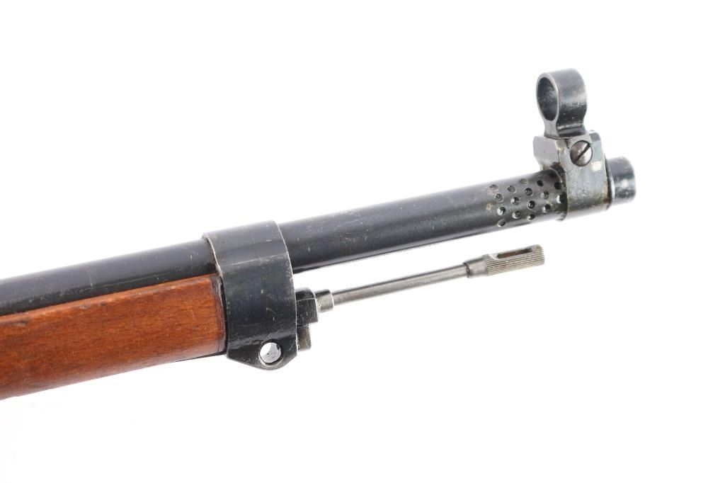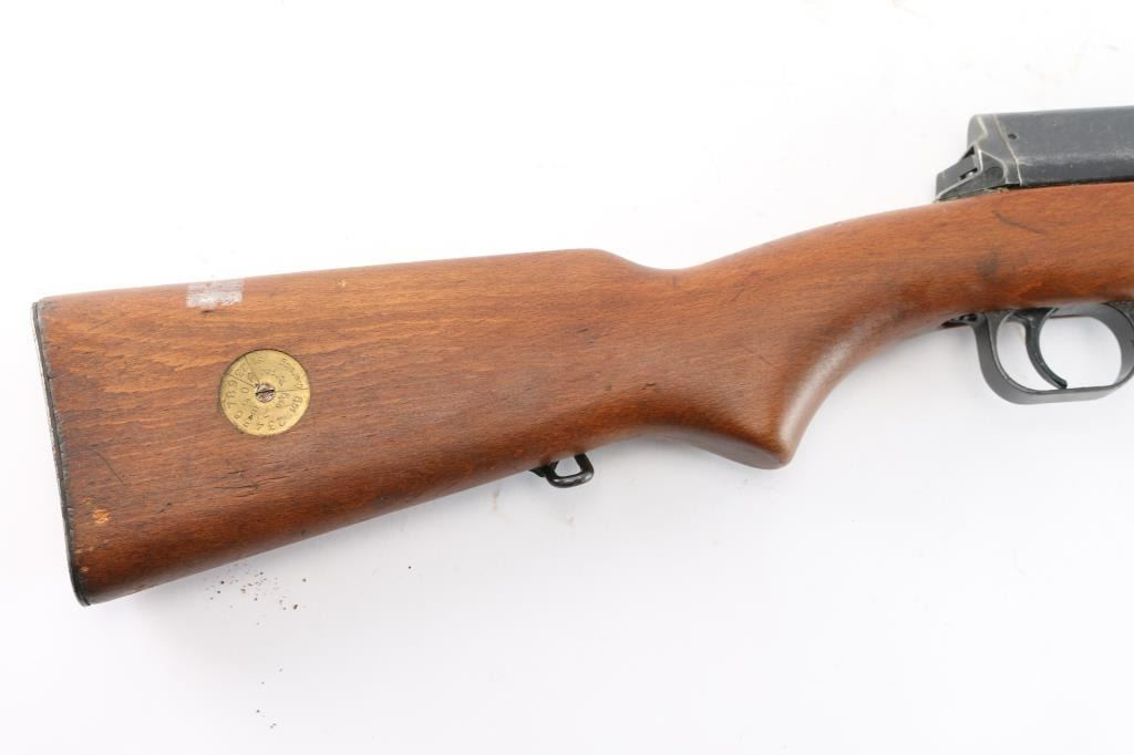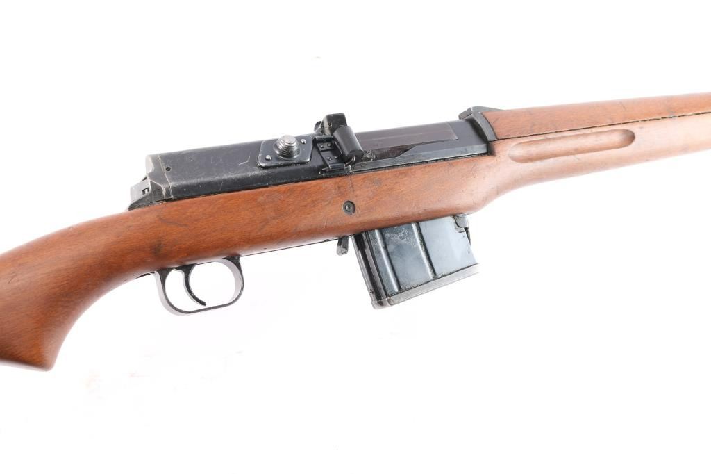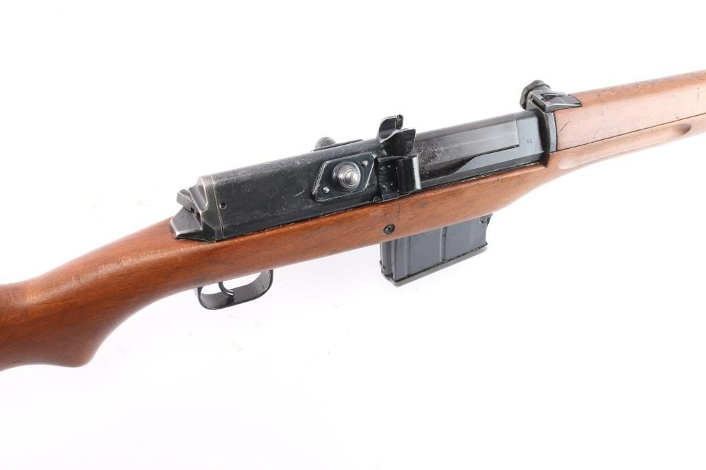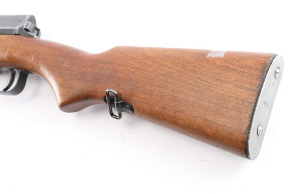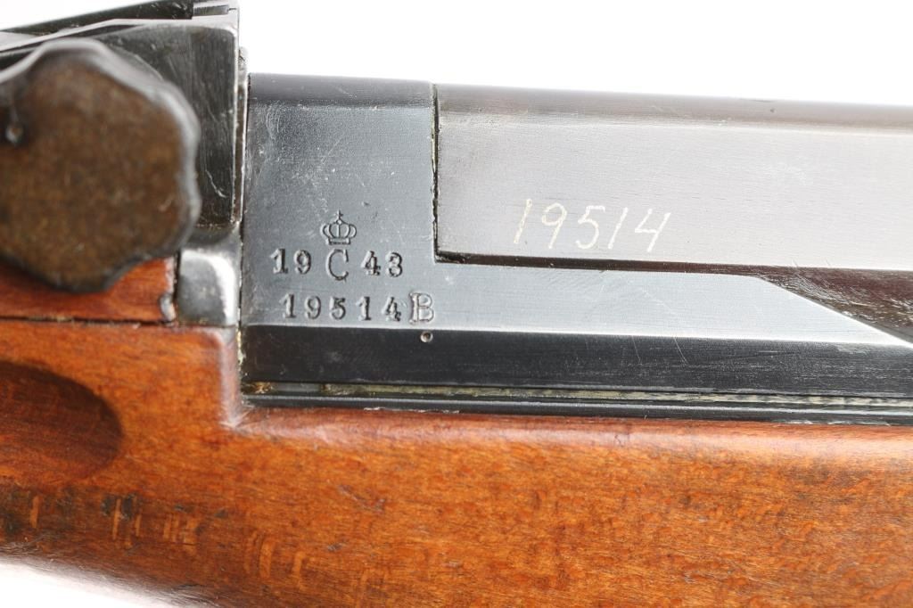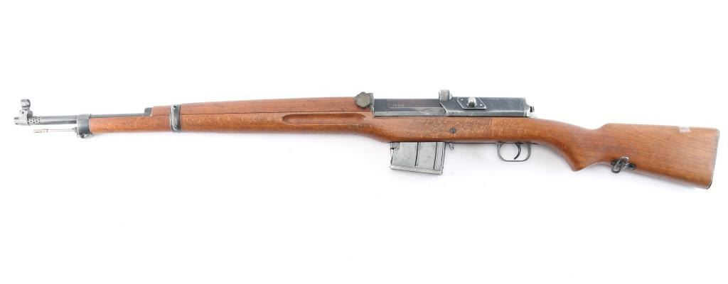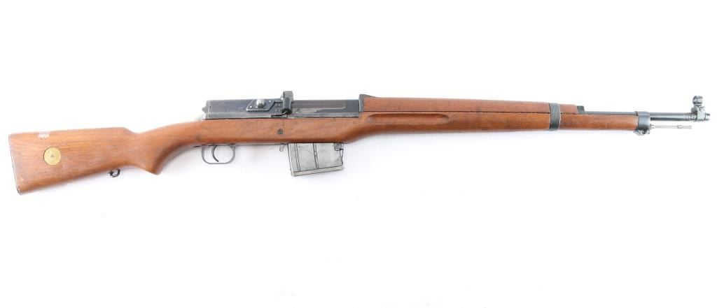 Scarce 'Ljungman' WWII era Swedish military direct gas impingement semi-automatic service rifle chambered in 6.5x55mm Swedish, manufactured circa 1943. The AG42 was designed in 1941 and put into production the very next year, with room for improvements nearly all of the 30,000 produced were modified between 1953-1956. The modified rifles such as this one were designated with a "B" suffix on the model designation and on the serial number. The changes include large charging cones on both sides of the top cover, a rubber shell deflector, a new rear sight knob, a stainless steel gas tube, new cleaning rod and new magazine. Imported by Sarco of Stirling, NJ. with import marks on the barrel. It features a blued finish, an internally threaded 24.5" barrel with integral muzzle break, windage adjustable hooded post front sight, elevation adjustable rear sight tuned for spitzer bullets, smooth trigger, manual safety on the rear of the receiver, integral stripper clip guide on the top cover, 10 round detachable magazine, cleaning rod, provisions for a bayonet, smooth wood handguard and semi-pistol grip shoulder stock with finger grooved forend, brass stock disc & smooth metal buttplate. The serial numbers match on the receiver, bolt(forced), bolt carrier(forced), and buttplate. The stock disk is marked #2 bore condition and 8 holdover. The right side of the receiver is stamped "S.S." Rifle exhibits approximately 80% of it's blued finish showing scattered wear/handling marks, and the bolt turned plum. Action is strong, the bore full of cosmoline where condition cannot be determined and the wood stock is very good with tape residue on the top of the buttstock.