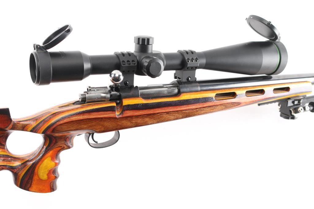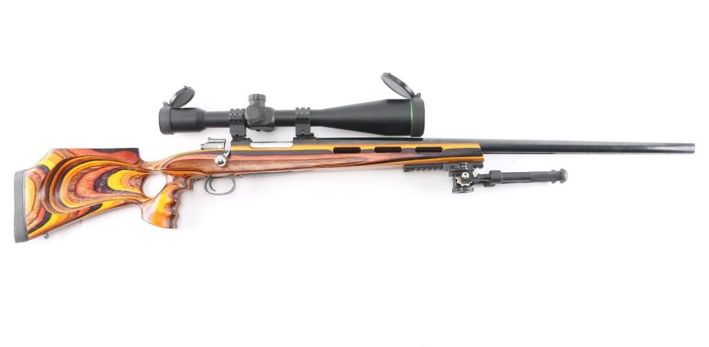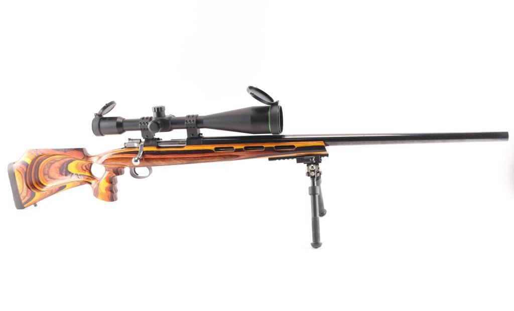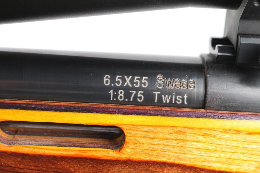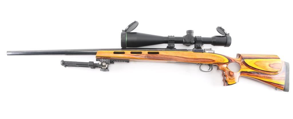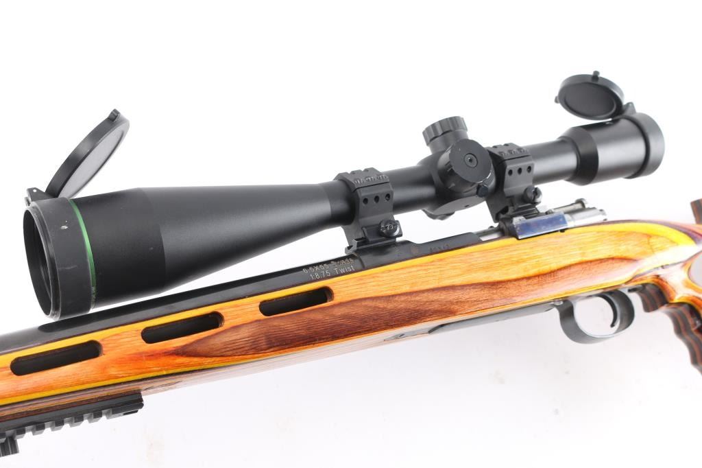 This is a custom bench rest/target rifle by Dan Pederson of Classic Barrels & Gun Works, Prescott AZ. Built on a Swedish Carl Gustafs Mauser action chambered in 6.5x55mm.. 27" high polish blue, heavy bull barrel with recessed crown, no provisions for sights, 1:8.75 twist, ported laminated thumbhole "Tac Driver" stock with high comb cheek rest for right-handed shooting, black rubber recoil pad, accessory rail on underside of forearm with adjustable bipod installed. Mounted with a excellent condition Mueller 40x56 side focus scope, target dot reticle, clear optics. Bore is pristine, wood and finish are excellent. Consignor states only 4 rounds have been fired through this rifle.