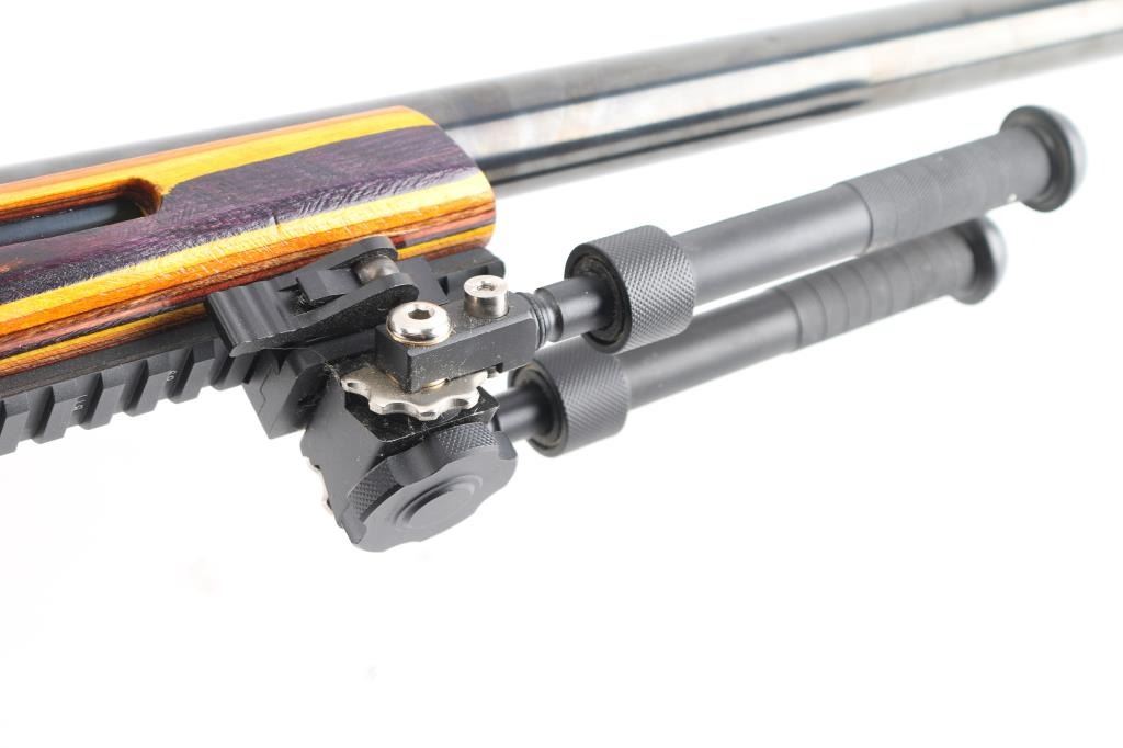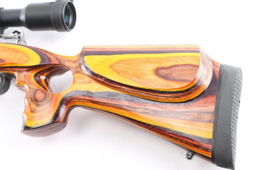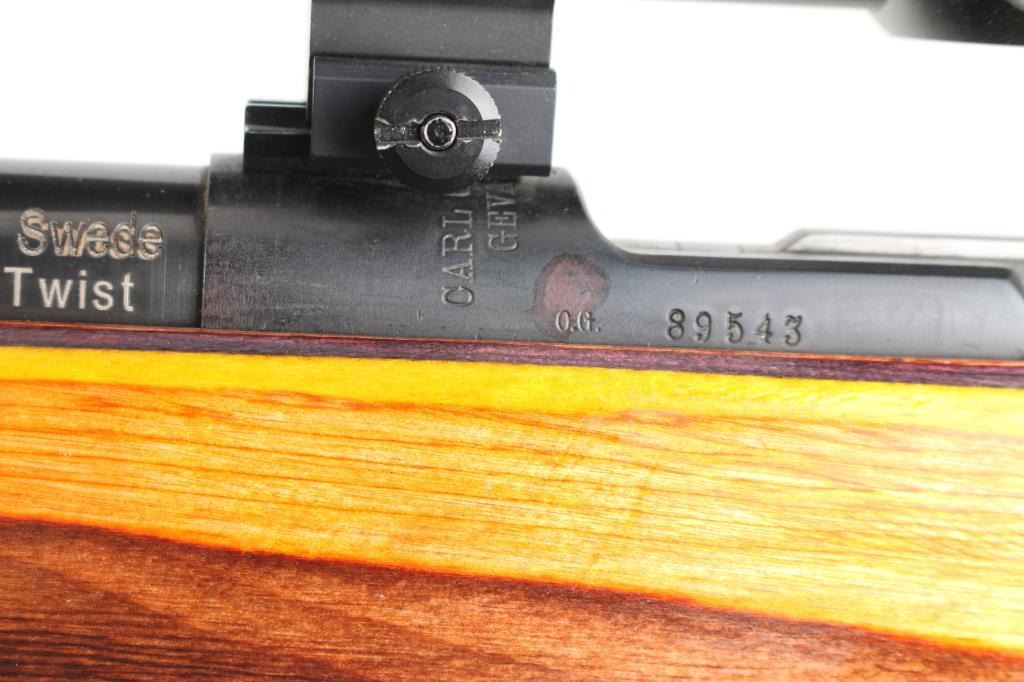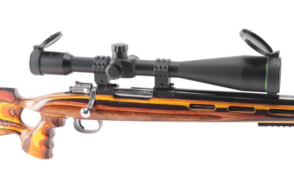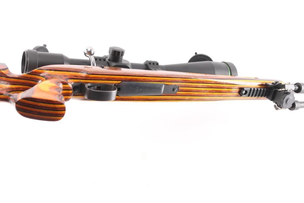 This is a custom bench rest/target rifle by Dan Pederson of Classic Barrels & Gun Works, Prescott AZ. Built on a Swedish Carl Gustafs Mauser action chambered in 6.5x55mm.. 27" high polish blue, heavy bull barrel with recessed crown, no provisions for sights, 1:8.75 twist, ported laminated thumbhole "Tac Driver" stock with high comb cheek rest for right-handed shooting, black rubber recoil pad, accessory rail on underside of forearm with adjustable bipod installed. Mounted with a excellent condition Mueller 40x56 side focus scope, target dot reticle, clear optics. Bore is pristine, wood and finish are excellent. Consignor states only 4 rounds have been fired through this rifle.