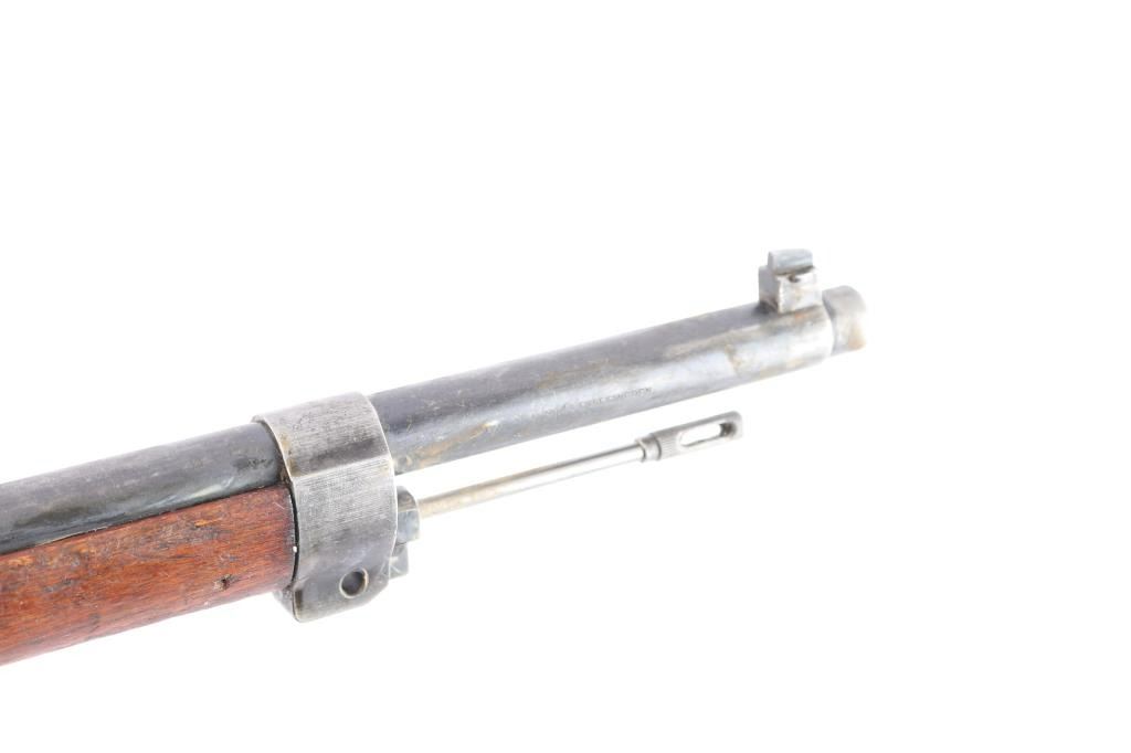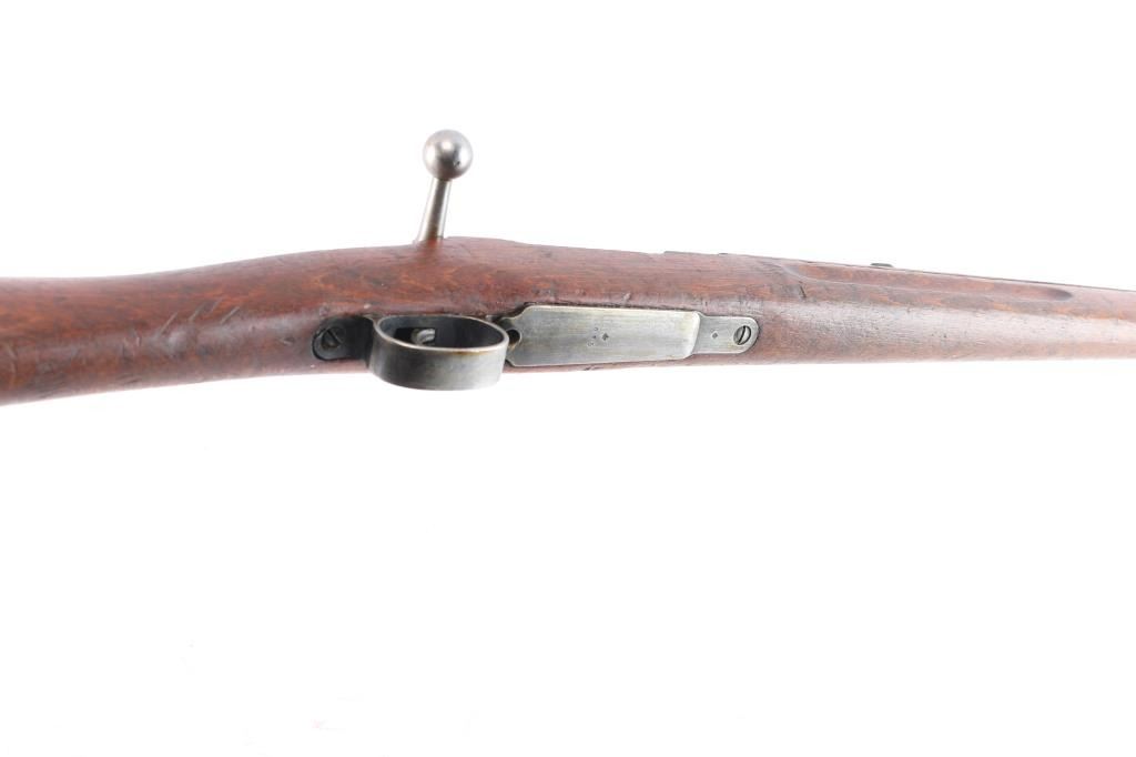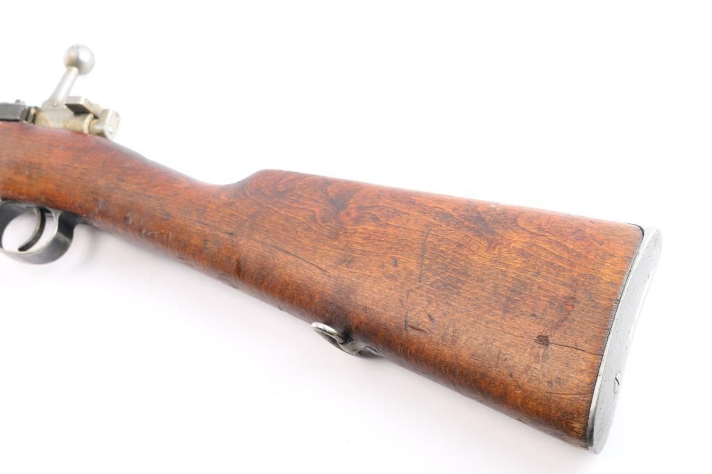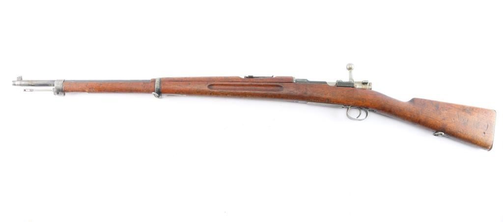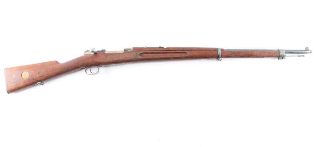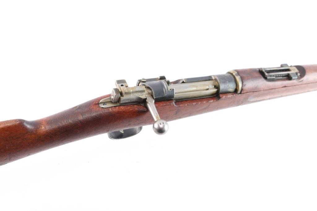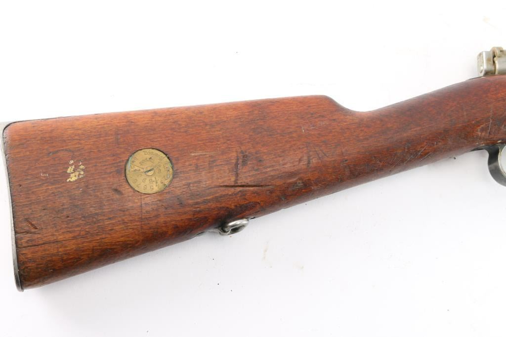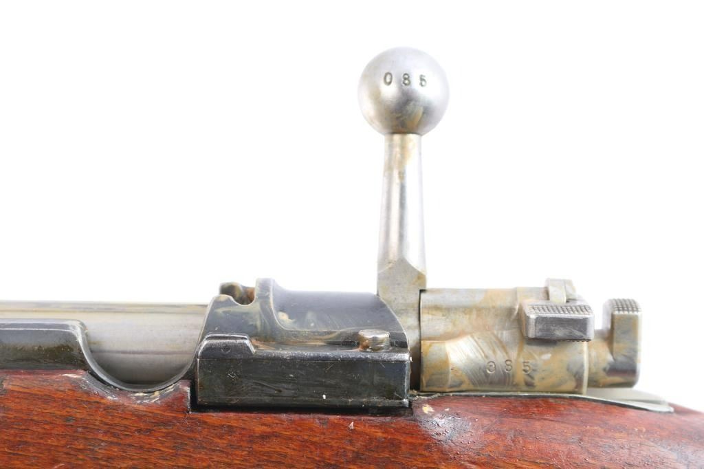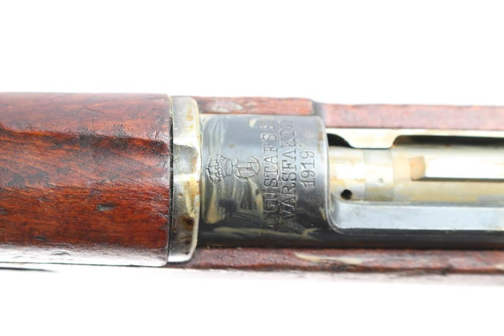 Bolt-Action military rifle manufactured in Sweden by Carl Gustafs Stads Gevarsfaktori, marked on receiver ring, dated 1919. Long rifle chambered in 6.5x55mm Swedish. Imported by CAI of St. Albans, VT. with import marks on the right side of the barrel. Features a blued finish, 29" barrel, dovetailed partridge blade front sight, flip-up ladder rear sight graduated to 800 meters, bayonet lug, cleaning rod, smooth curved trigger, polished in-the-white bolt with straight handle & three position safety on the rear, 5 round internal box magazine, smooth wood handguard, finger grooved forend, and full-length straight grip shoulder stock with brass Torped Overslag stock disc, and smooth metal buttplate. Matching serial numbers (085) are found on the receiver, bolt knob, bolt sleeve, cocking piece, safety lever, rear slight leaf, floor plate, rear sight slider, bolt release, both barrel bands, and buttplate. The stock disk is marked #1 barrel condition and '3' holdover. Rifle retains approximately 60% of its blued finish with some dulling/edge wear,with no observed rust but is covered with hardened grease. The rifle has minor scratches/scuffs on surface finish, and the buttplate is in-the-white. Action is smooth, the bore is dirty but has strong rifling. Wood stocks are fair with a 1.75" crack by the buttplate, and a couple heavy marks on the right side along with normal handling blemishes.