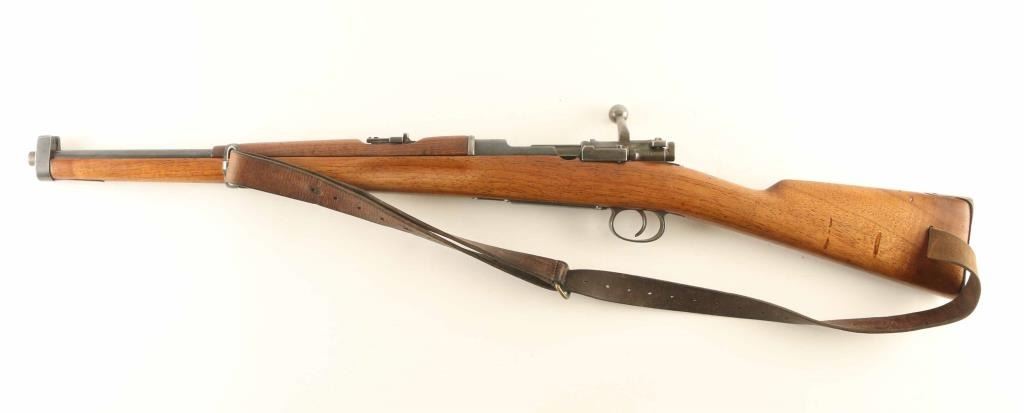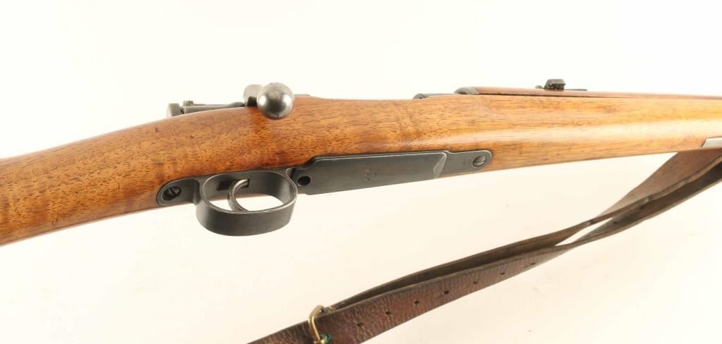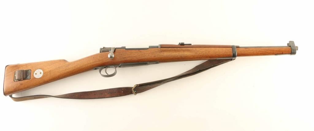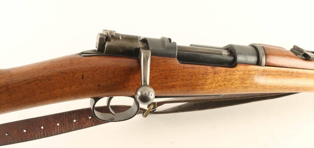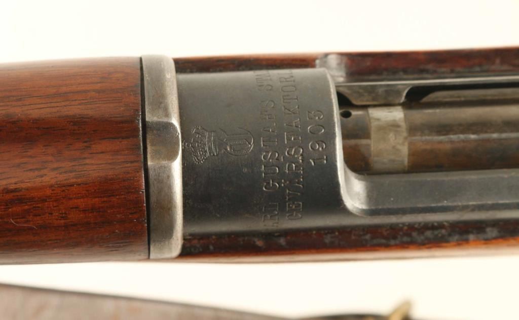 Swedish military bolt action rifle dated 1903. Features blued finish, full length wood stock with straight wrist, 18" barrel, blade front sight with protector ears, flip-up rear sight with elevator bar, turned down bolt handle, front sling swivel, rear sling slot, manual safety. Bore is fair to good, dark with strong rifling. Metal retains 70% blued finish, discolored on much of floorplate, with bright metal at most sharp edges. Bolt assembly has been blue, similar color to cold blue, has a thin mottled brownish gray appearance. Wood is good condition. Stock appears sanded, with loss to finger groove edges and small gaps around buttplate. No import marks observed. Marking disk in stock marked "M / MDN / 490". Last 3 digits of serial number repeated on all observed marked parts. Includes good condition original sling with stock buckle. Condition is NRA Good+ *** C&R Firearm ***