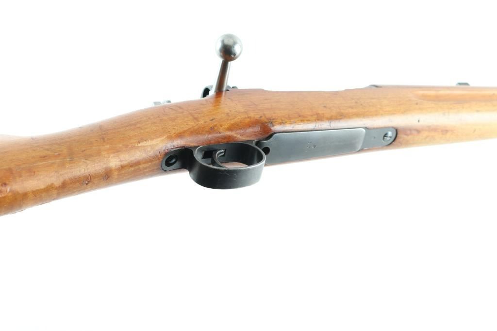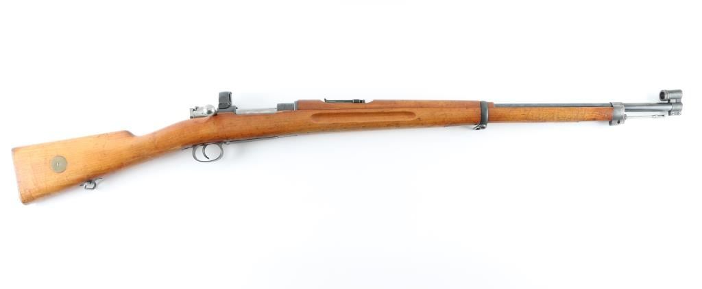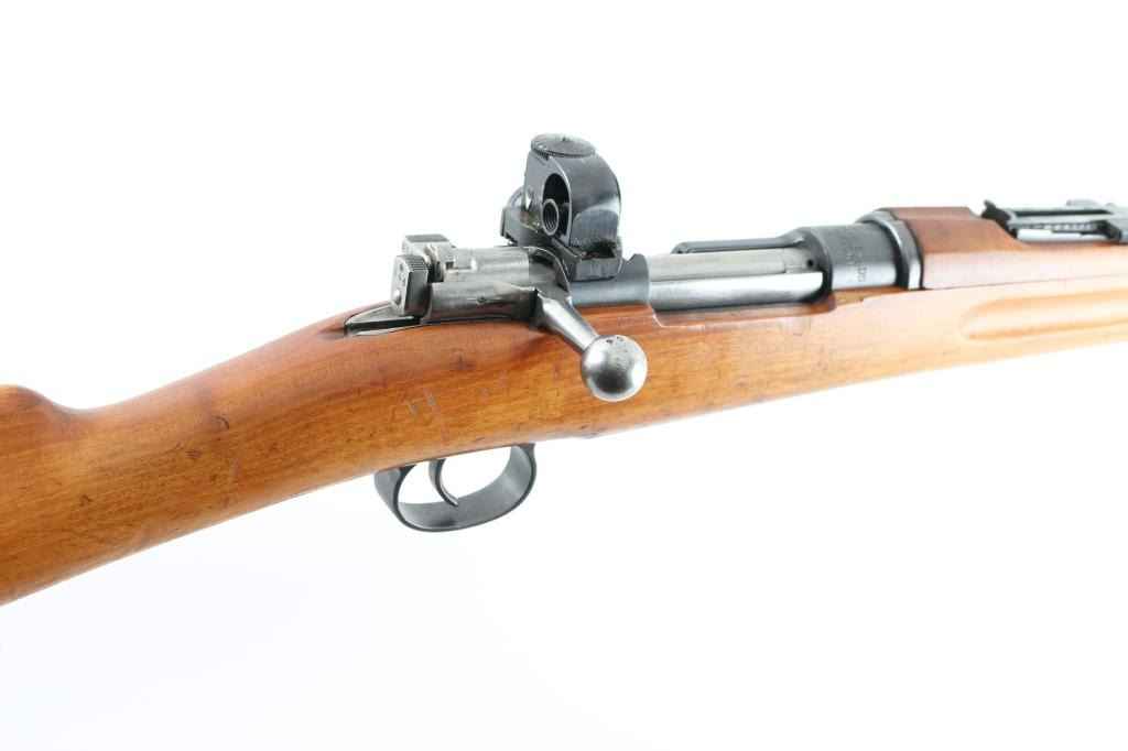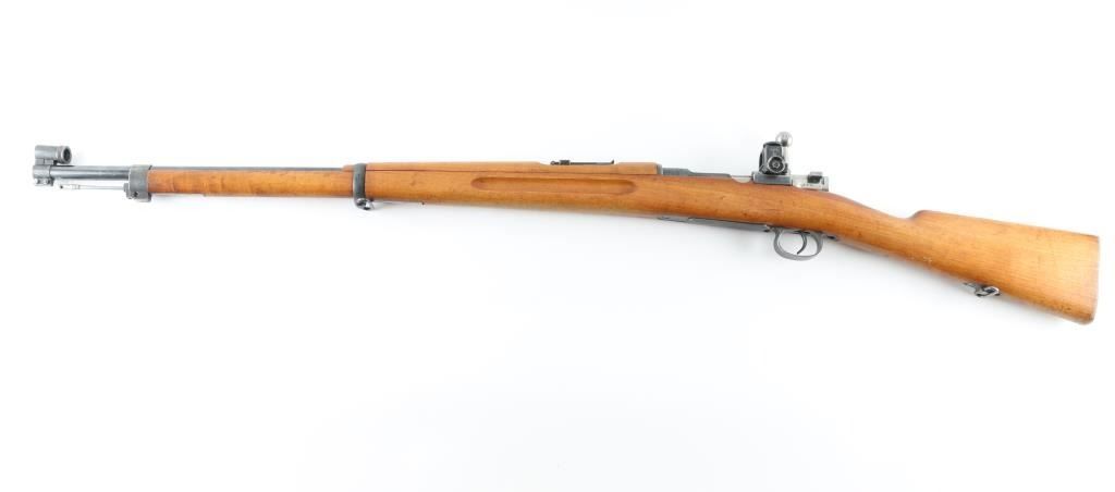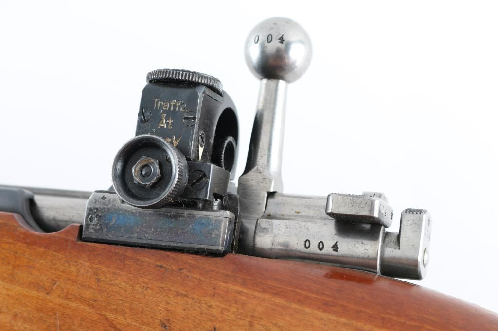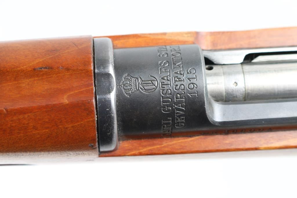 Swedish military bolt action service rifle manufactured in 1915. Features a blued finish, 29" barrel. bayonet lug, cleaning rod, sling swivels, polished bolt, integral box magazine, manual safety, and straight grip full length shoulder stock with smooth metal buttplate. Serial numbers match on receiver, floorplate, bolt , bolt release, buttplate, and bolt sleeve. Mismatched barrel bands. This rifle has issue target sights installed. The rear is a M/Sodedrin Diopter peep sight, with matching Globe front sight. Bore appears very good bright.. Approximately 75% finish is retained overall, with some handling wear. Wood stock is good., with some minor scratches, dings.. Has Torped brass disc inletted in left buttstock. Imported by SAMCO, marked on underside of barrel. NRA Condition-Very Good C&R Firearm.