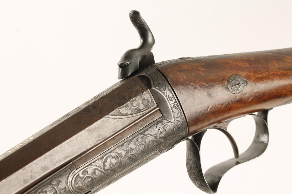 Caron single barrel percussion shotgun; 16 gauge, 31.5” barrel with gold inlaid address “Caron a Paris/Arqe de S. M. L’Empereur”; engraved frame, lock plates, hammer, trigger guard and butt plate; crisp action, dark patina overall, checkered wood butt stock with some scattered mars and scratches from carry and storage; cased in lined French style wood box with accessories. Caron was a top French maker and in the employee of Napoleon III. Est.: $1,750-$3,500.
