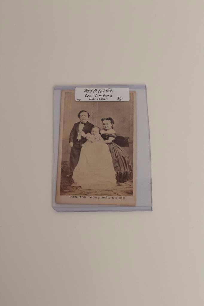 Carte de visite of Gen. Tom Thumb, wife and child. Measures 4 ¼” x 2 ¼”. In good condition. Famous showman during 19th century with Barnum and Bailey Circus and world recognized little person. Est.: $100-$200