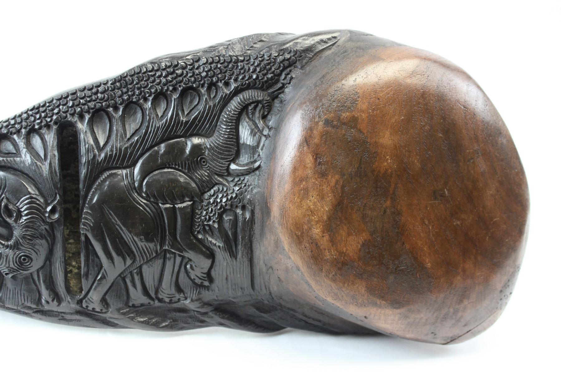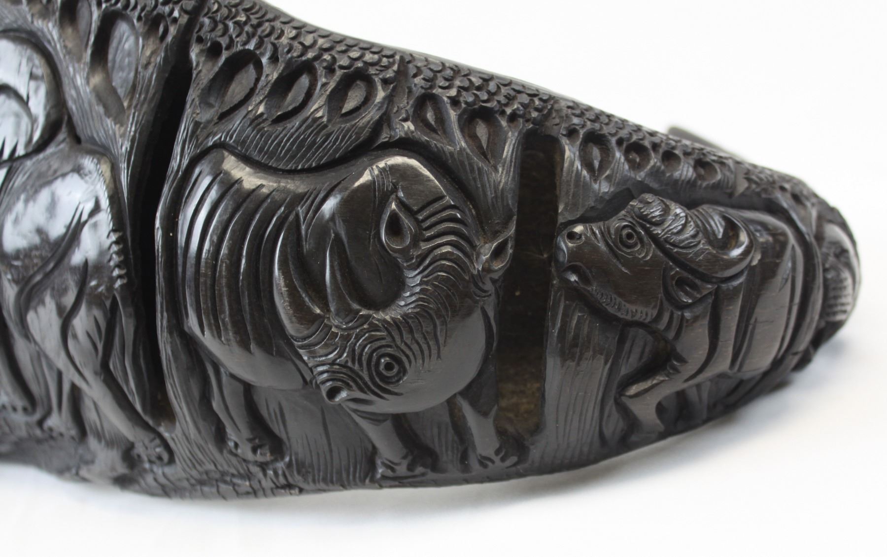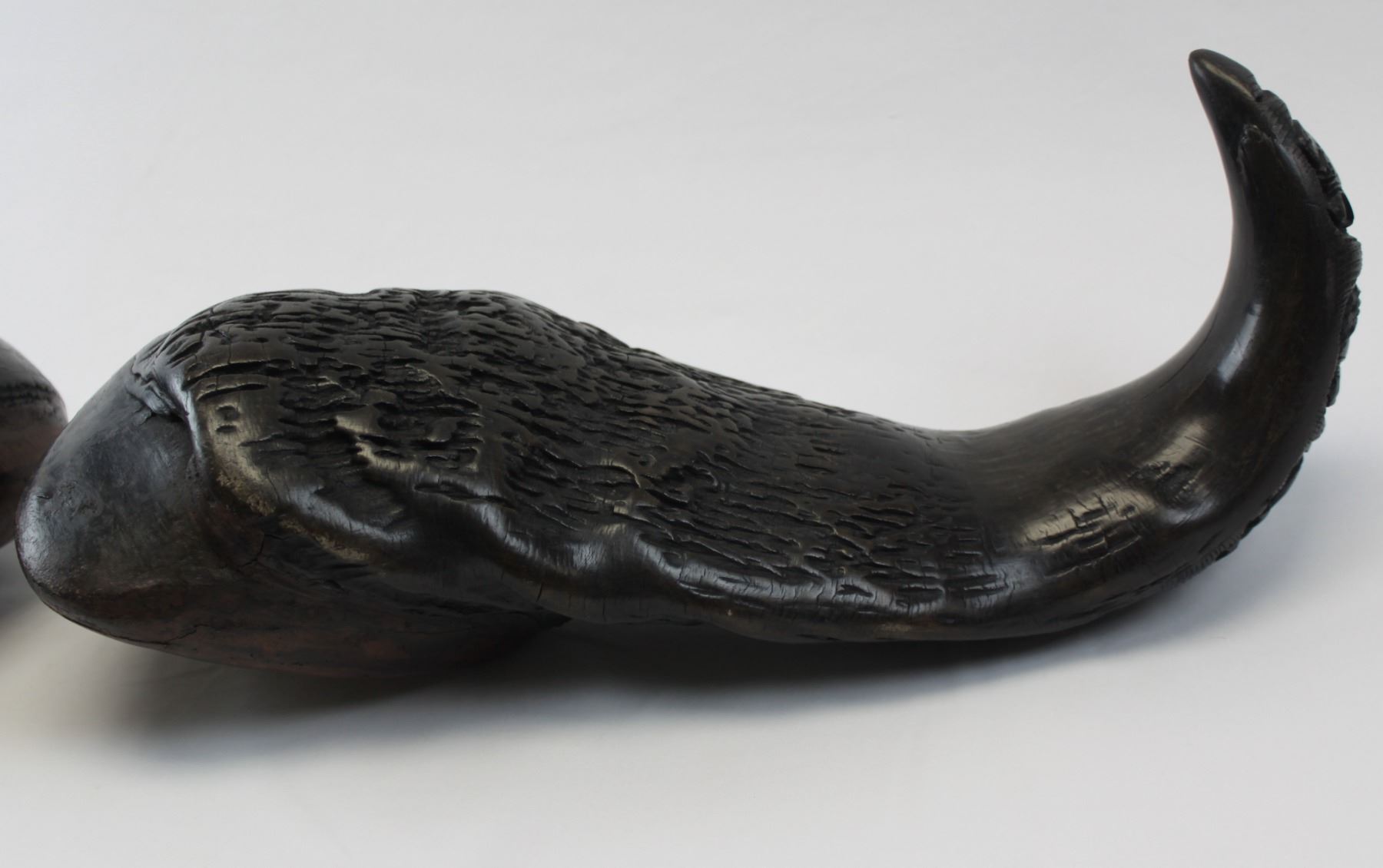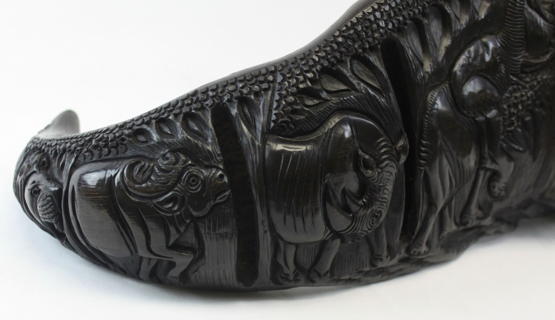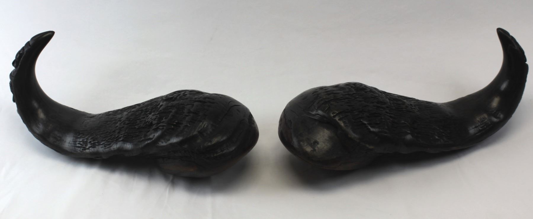 This is a matched pair of hand-carved Cape buffalo horns. You never see Cape buffalo horns used in artwork or crafts because they are so expensive and dangerous to hunt, and a matched pair is rarer still. These horns have been meticulously hand-carved by a tribal craftsman in Africa. The polished carvings depict the African “Big 5” on each of the horns. The wooden end caps, made from local African hardwood, have also been carefully formed and hand-fitted by the craftsman. These horns would measure 40" on a cape buffalo. These unique, one-of-a-kind horns will look great as a fascinating conversation piece in any home, office or trophy room. These carved horns are such an extremely rare find that they aren’t even found at the legendary SCI annual convention. You can search and search, but there are only two places you can find these – here at our auction, or somewhere in a small un-named village in the heart of the Dark Continent. Considering the cost of a Cape buffalo hunt, the days of meticulous work by a tribal craftsman, and the rarity of such a find, these horns will be an absolute bargain for the winner of this auction. NOTE: The winner should add these to their home insurance policy.